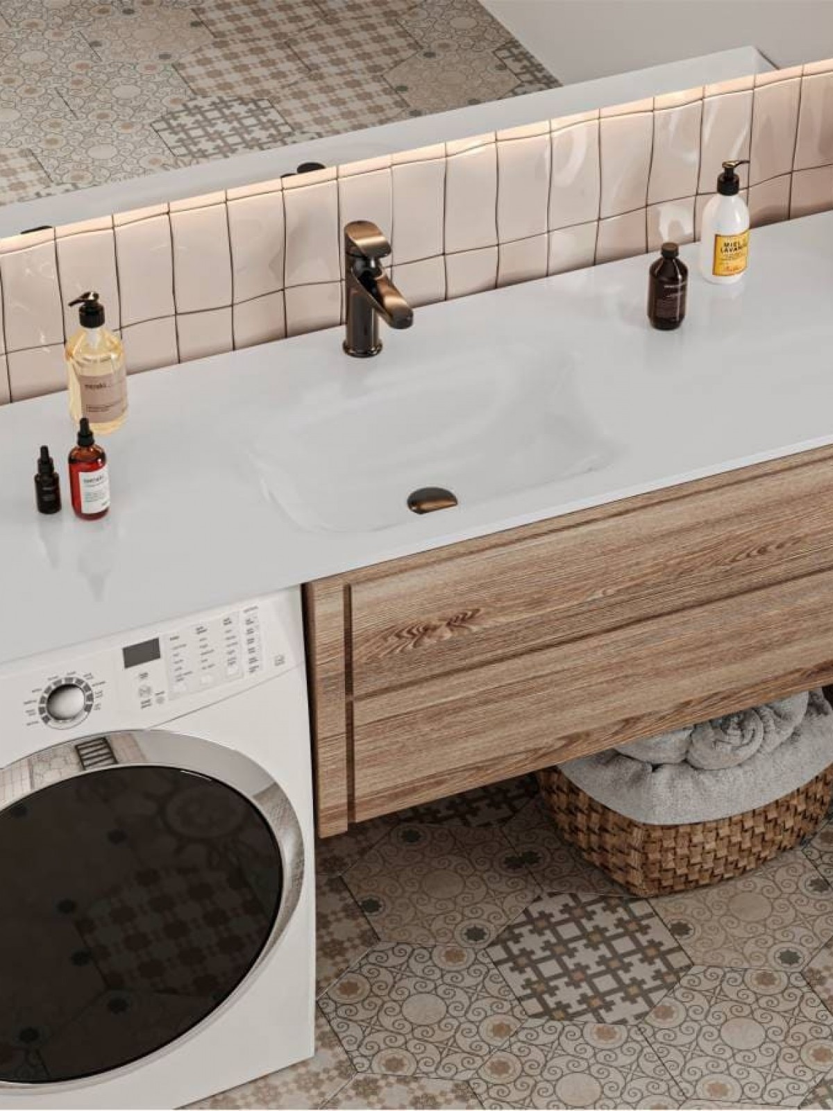 Прямокутний за формою чаші раковина має тип монтажу - на тумбу, врахуйте це перед замовленням меблів у ванну кімнату.