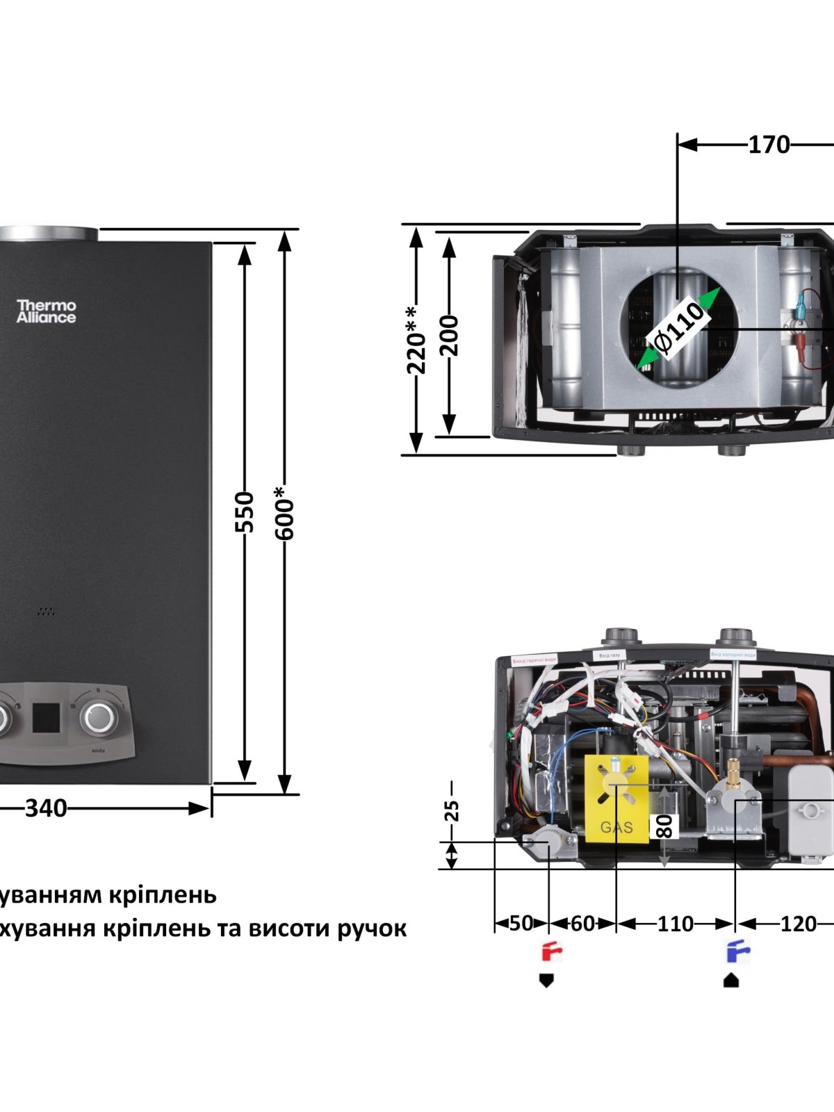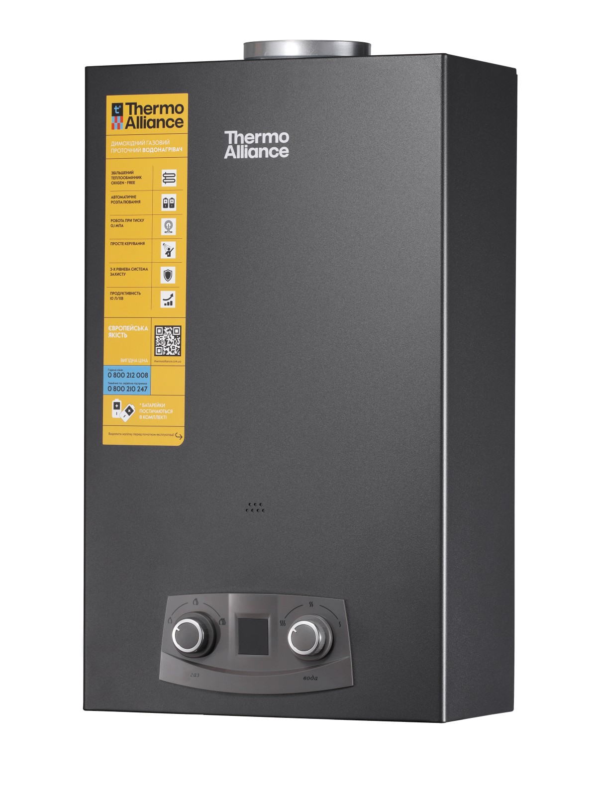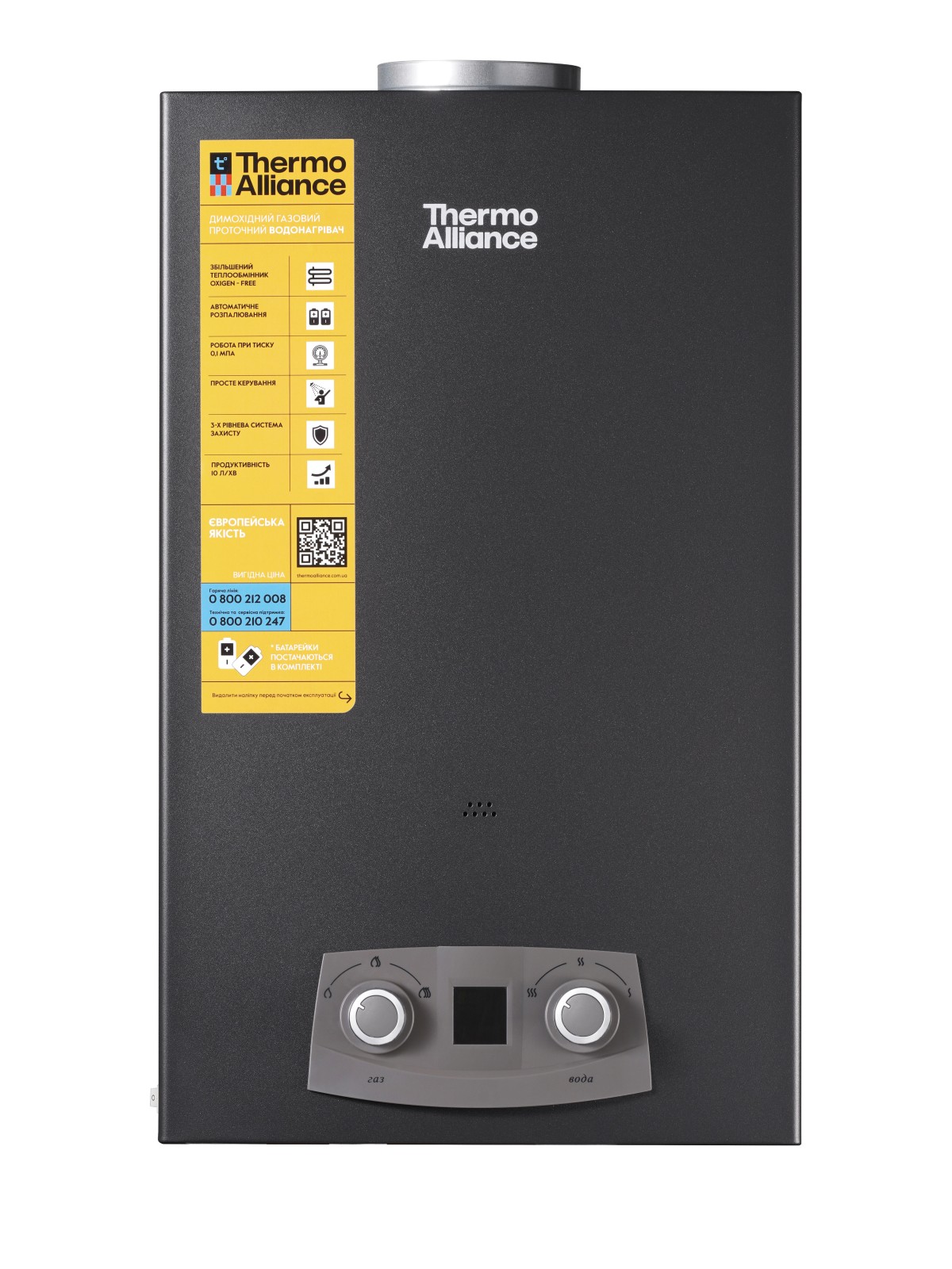 Газова колонка Thermo Alliance димохідна JSD20-10N-QB EURO+ 10л Black (чорна) namp;#8212; відмінне рішення для задоволення господарсько-побутових потреб у гарячій воді. Видалення продуктів згоряння газу відбувається за допомогою природної тяги. Електроживлення, яке необхідне для запуску процесу розпалу при відкритті крана ГВП, забезпечують дві батарейки постійного струму типу D. Корпус виробу чорного матового кольору , на лицьовій стороні внизу розташовані ручки регулювання параметрів роботи приладу. Теплообмінник виготовленний за технологією Oxygen Free (99,9% міді) вагою 2,4 кг з збільшеним перерізом труб.