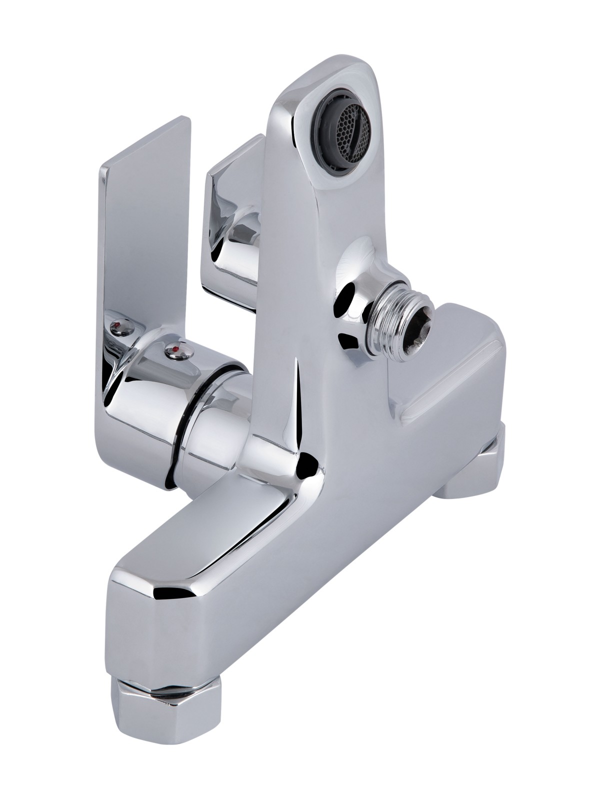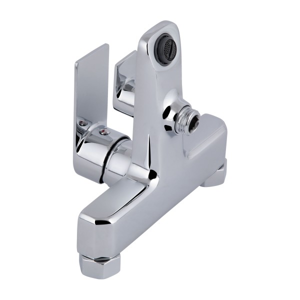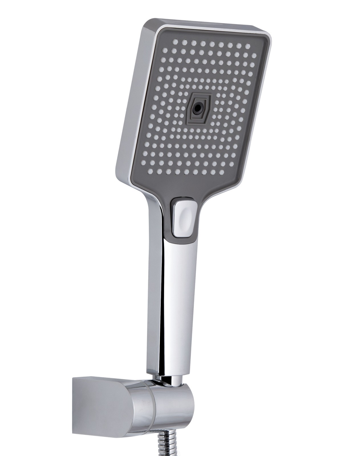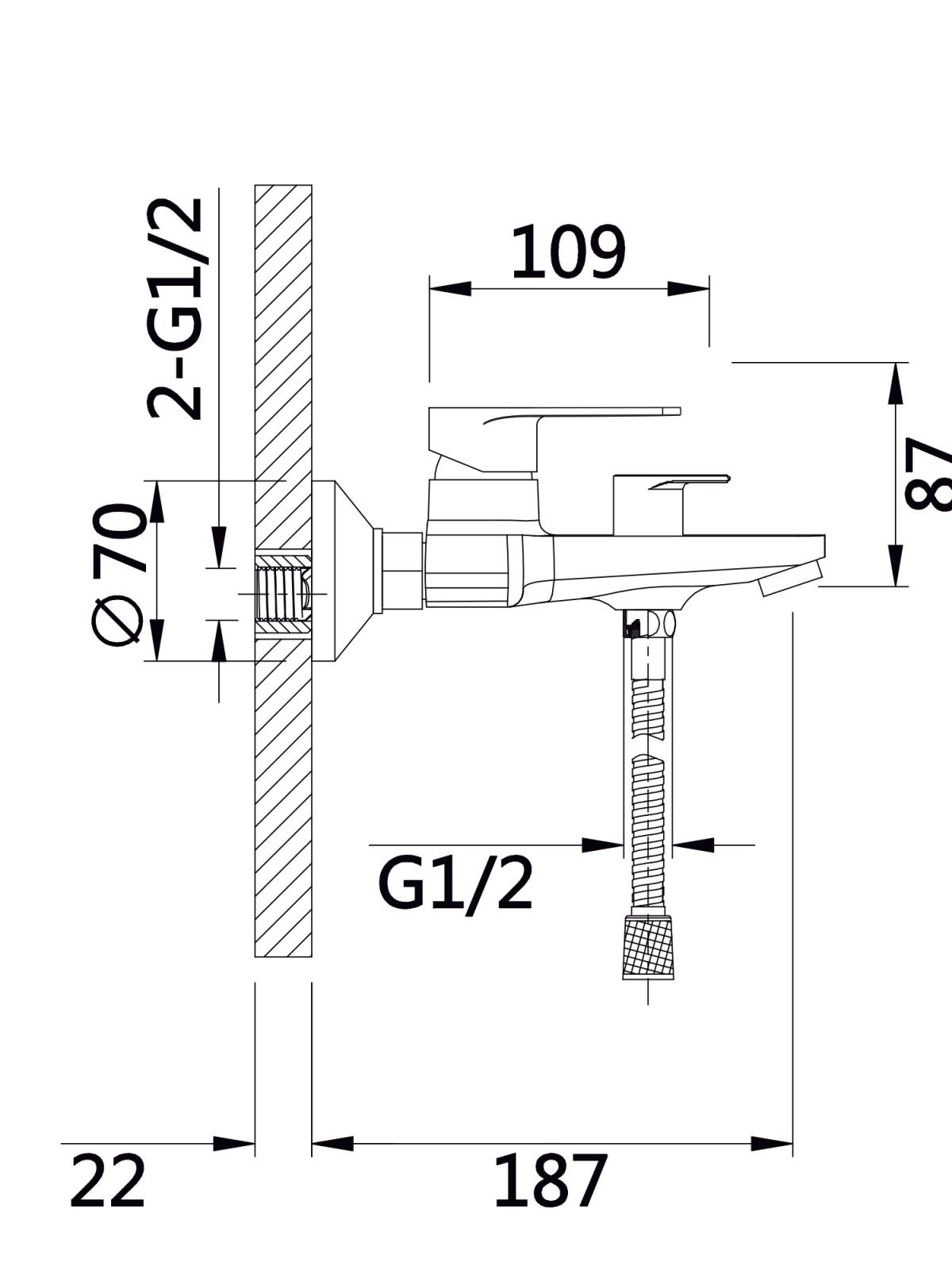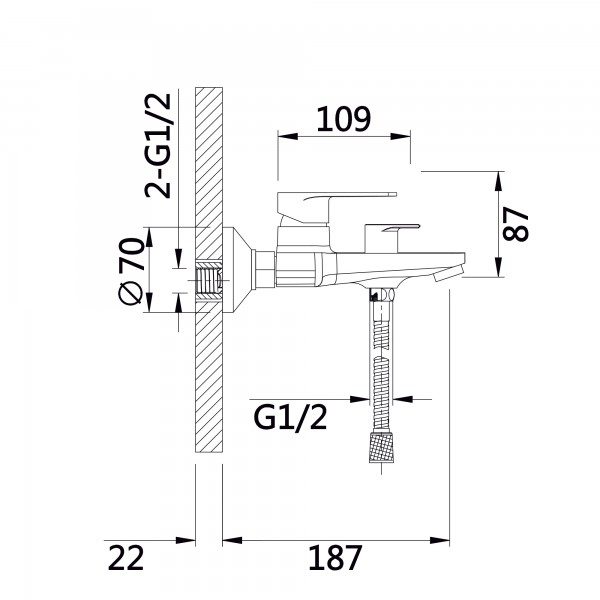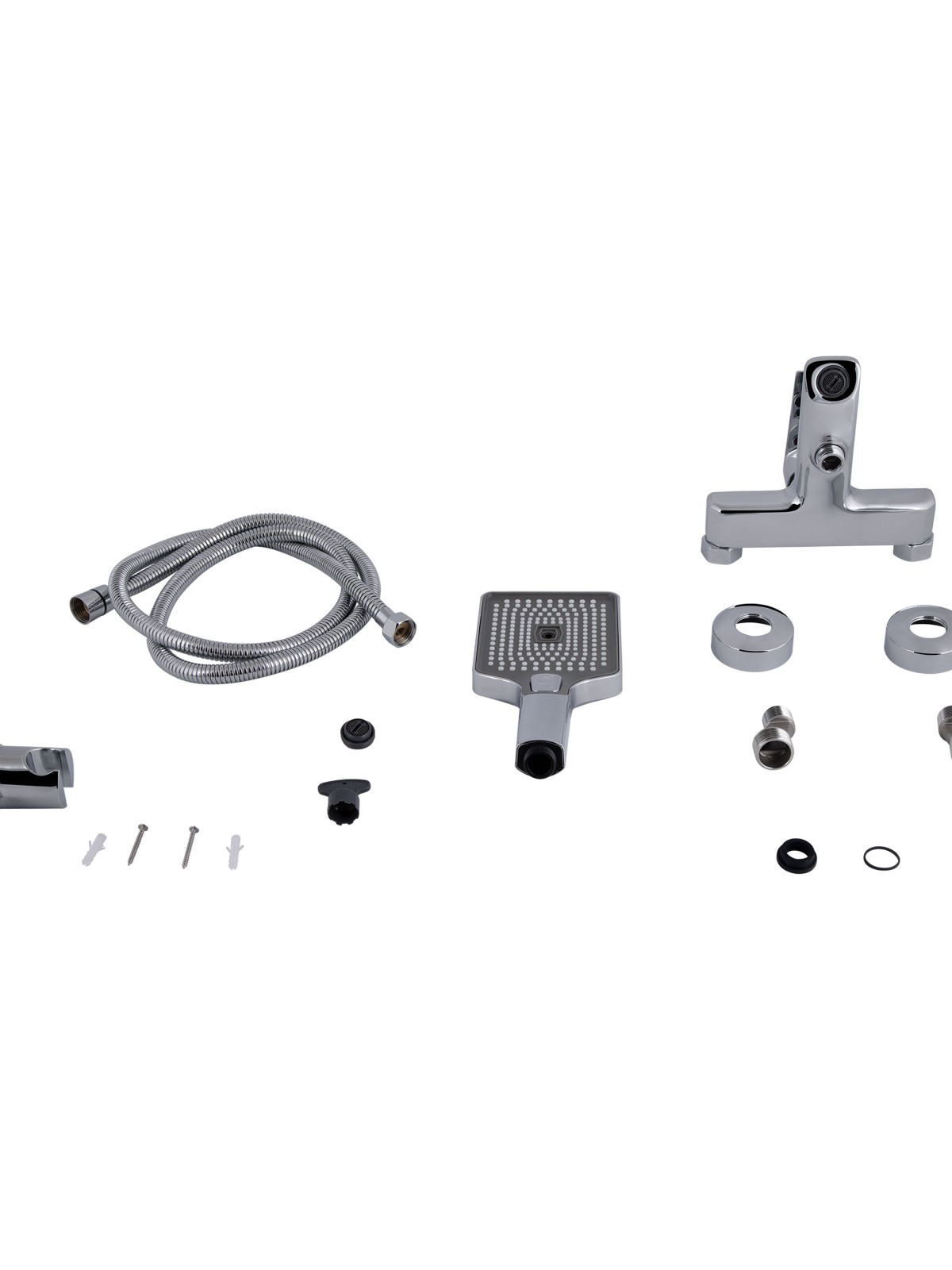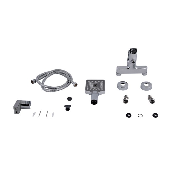 Комплектація: Настінний змішувач, ручна лійка, душовий шланг, тримач для лійки, монтажні ексцентрики з декоративними накладками, ущільнювальні кільця, кріплення та монтажний набір (гвинти й дюбелі).