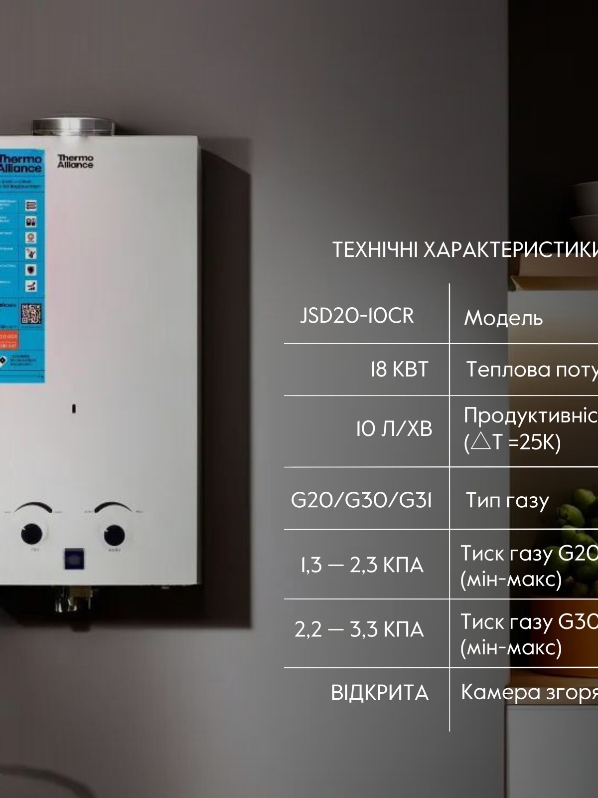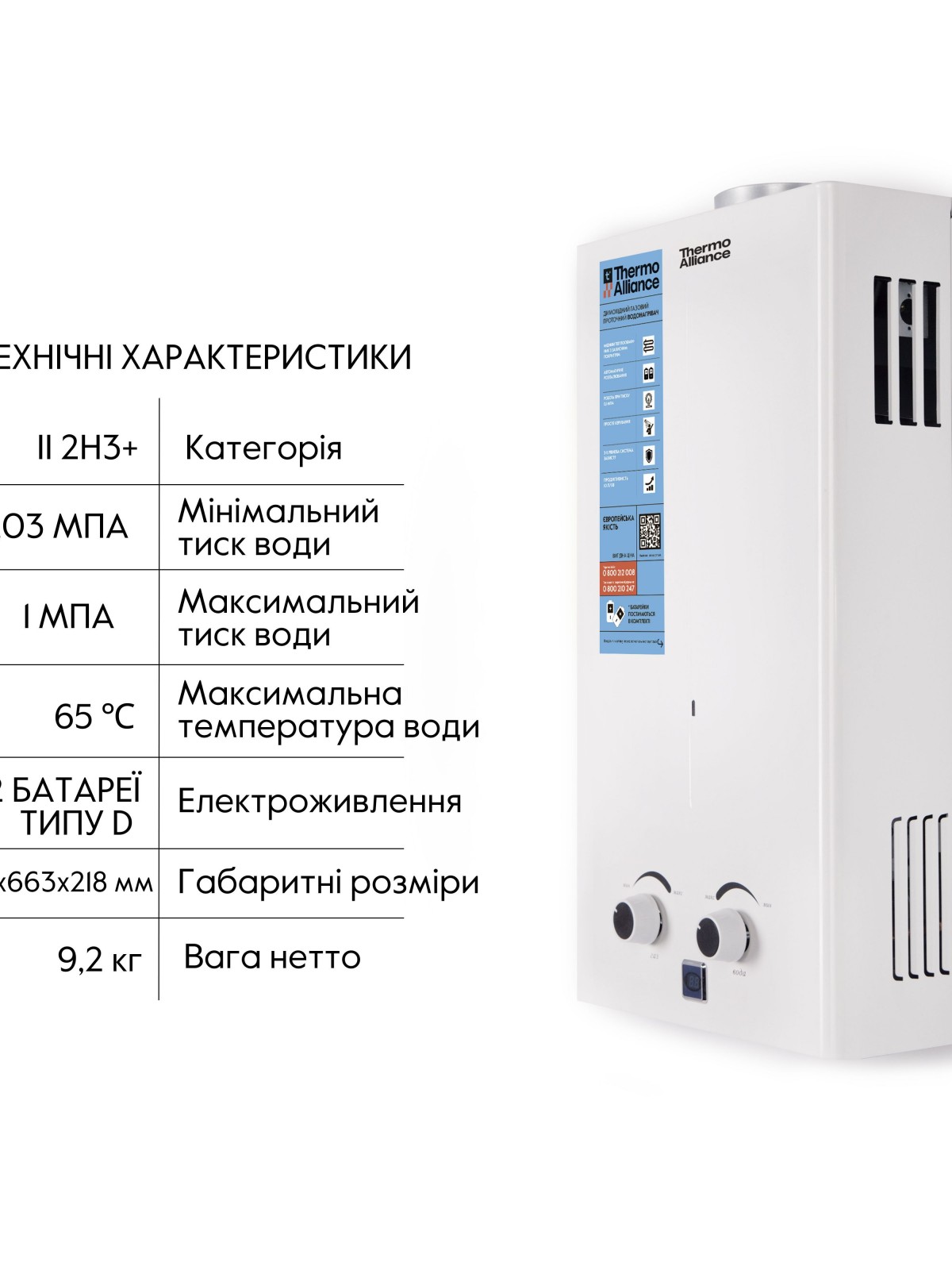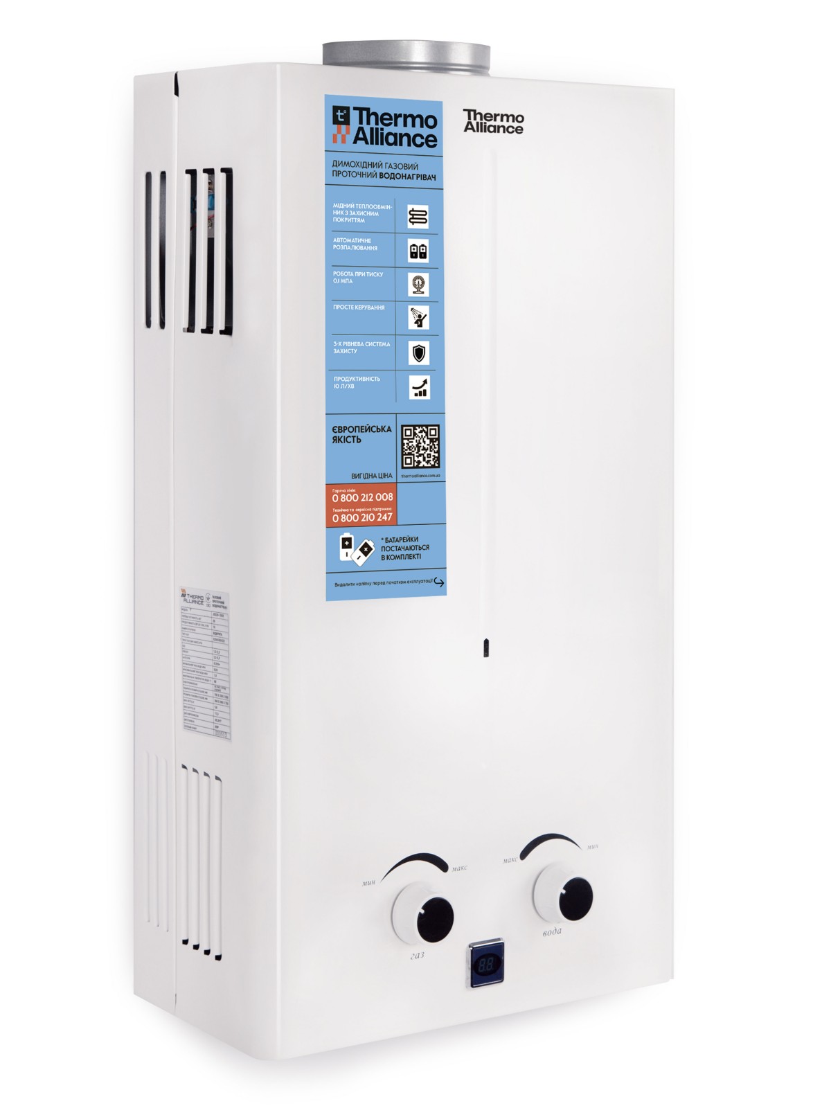 Газова колонка Thermo Alliance димарна JSD20-10CR 10 л біла namp;#8212; - прилад для нагріву проточної води, що використовує природний газ як джерело енергії. Також для роботи пристрою потрібно встановити в спеціальний відсік дві батарейки типу D. Джерело електроживлення потрібне для того, щоб розпалити пальник при відкритті крана гарячої води. Висока якість збірки, електронний дисплей, контроль димовидалення та наявності полум'я, захист від перегріву namp;#8212; все це реалізовано у конструкції виробу.