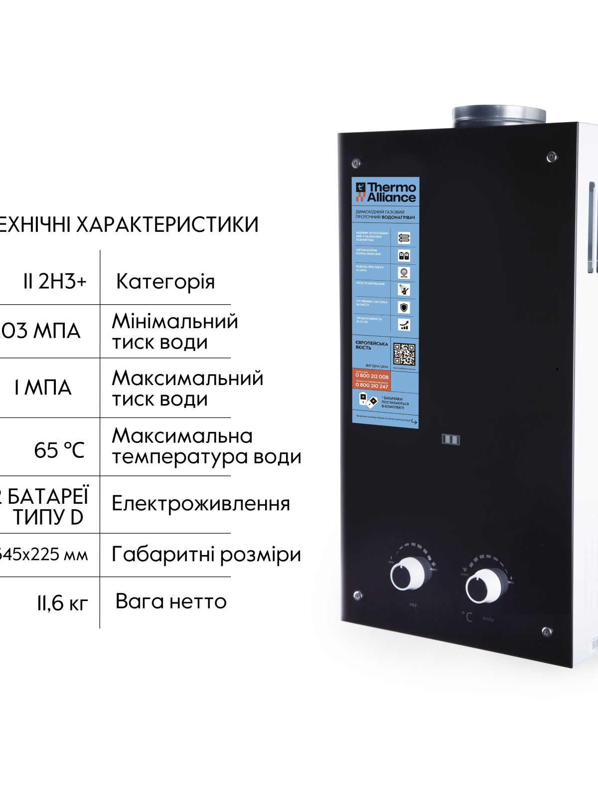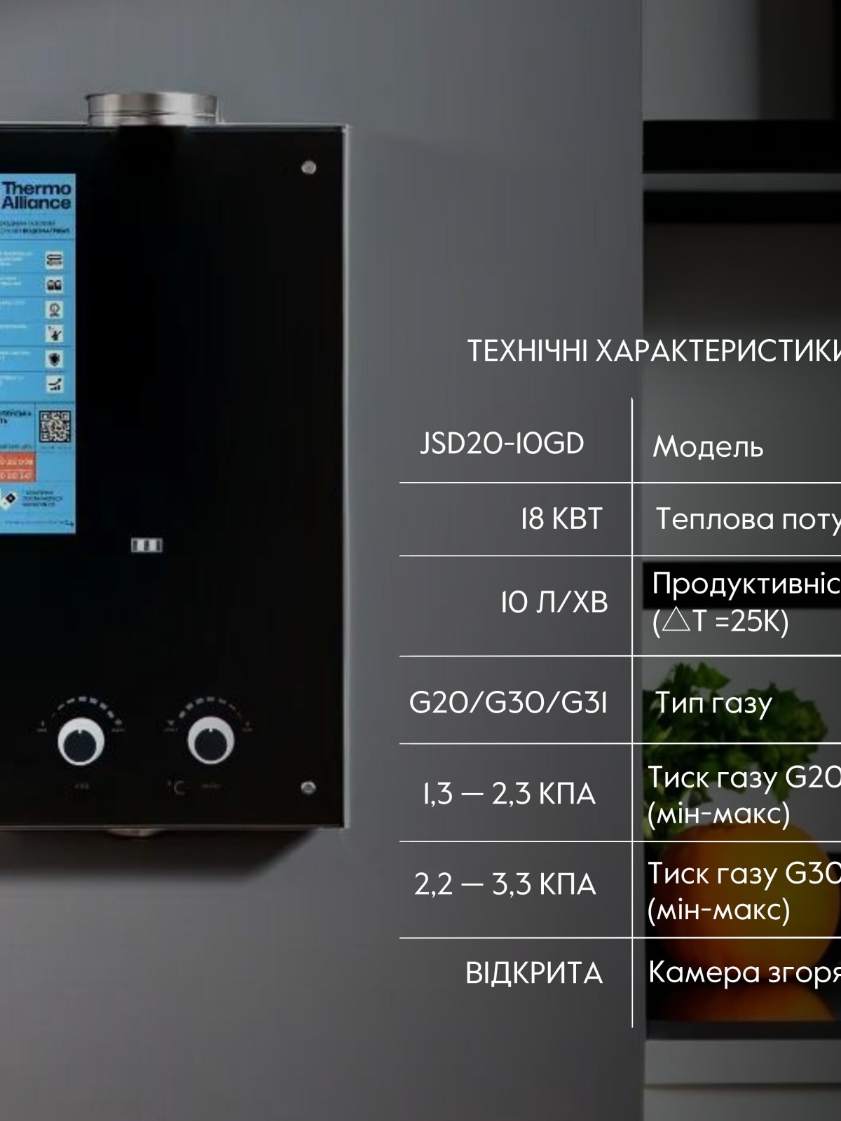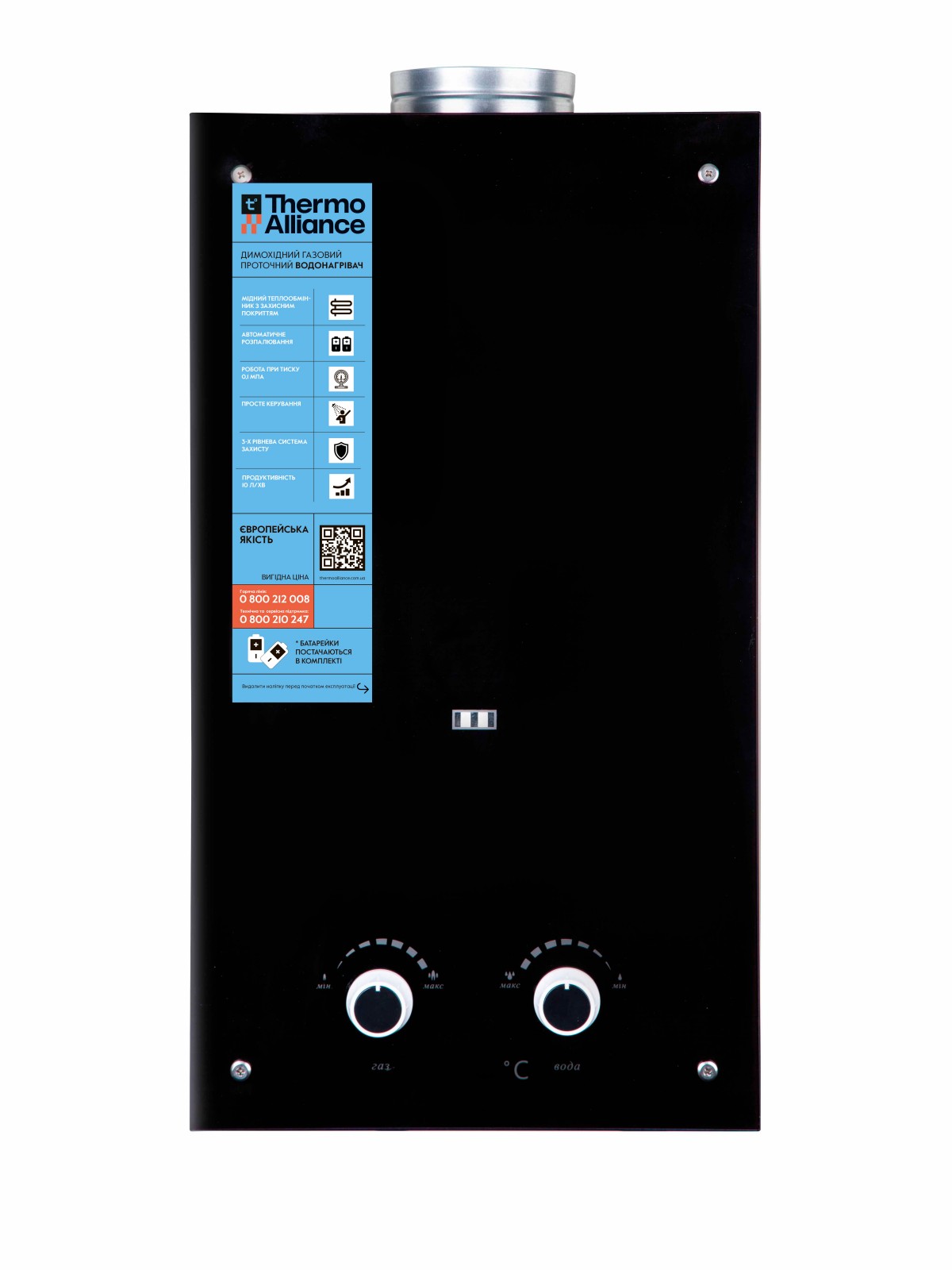 Газова колонка Thermo Alliance димарна JSD20-10GD 10 л скло (чорне) namp;#8212; сучасний, стильний і функціональний нагрівальний прилад з відкритою камерою згоряння. Для запуску процесу розпалу при відкритті крана мережі ГВП необхідно забезпечити електроживлення, для цього потрібно вставити у спеціальний відсік 2 батарейки (тип D). Монтаж, під’єднання водопровідних і газових труб, облаштування димохідних каналів та введення виробу в експлуатацію має виконувати лише уповноважений кваліфікований фахівець.