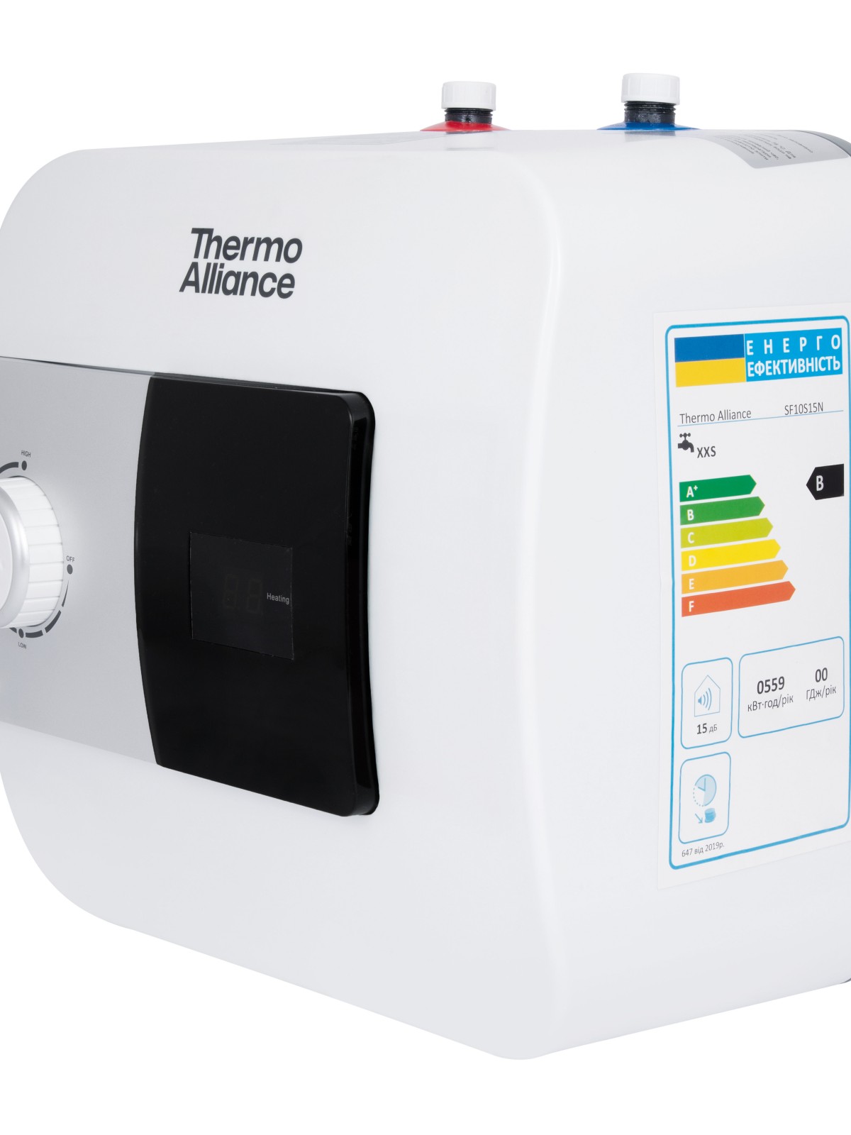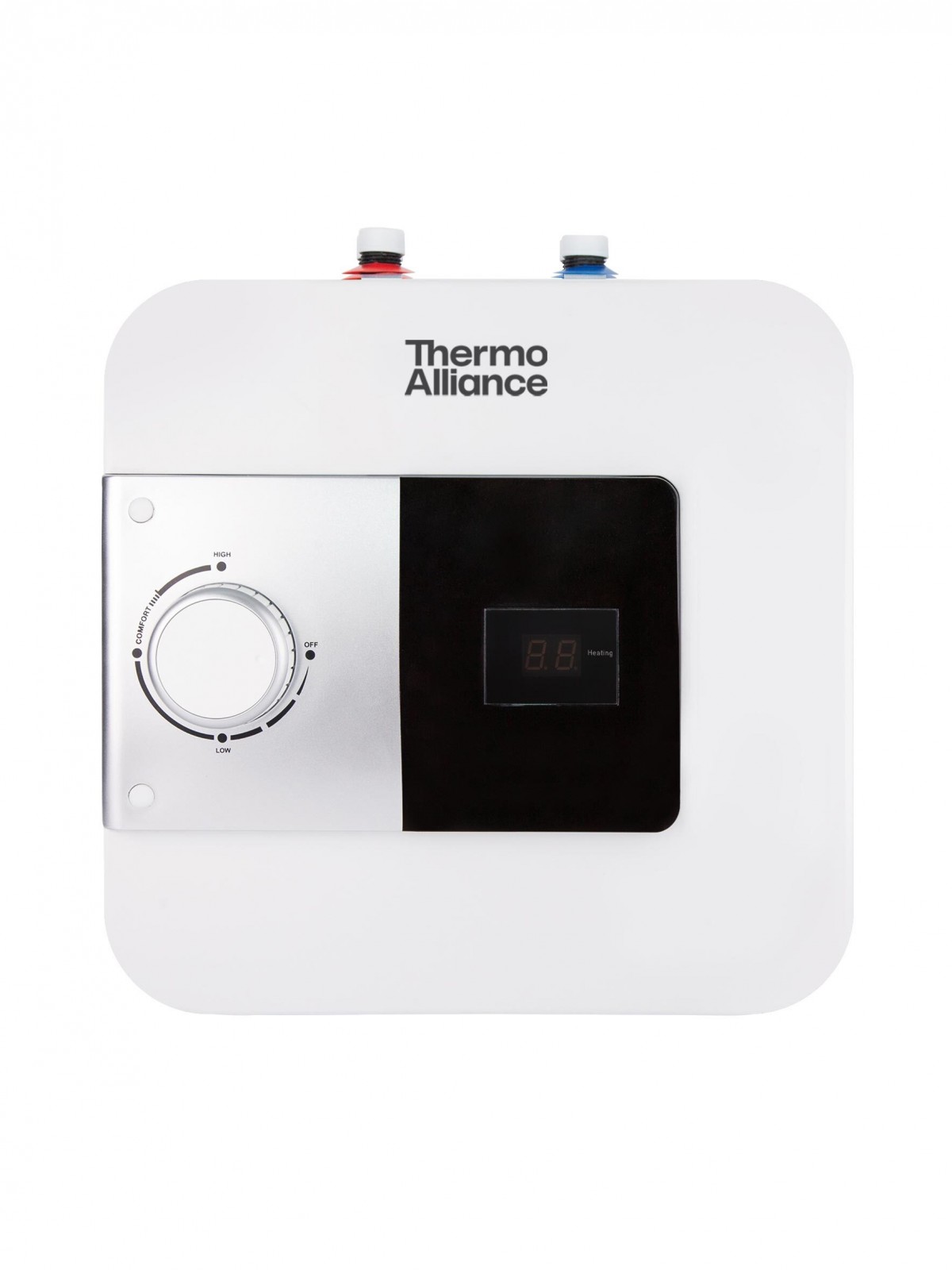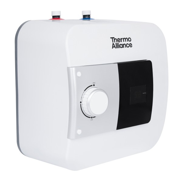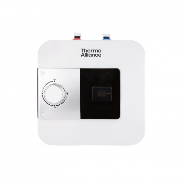 Водонагрівач Thermo Alliance 10 л під мийкою, мокрий ТЕН 1,5 кВт SF10S15N швидко нагріє невелику кількість води. Такий накопичувальний пристрій встановлюють в шафці під кухонним змішувачем. Патрубки підключення розміром1/2nquot; розташовані у верхній частині корпусу приладу. Панель управління оснащена індикатором роботи нагрівального елементу, дисплеєм, що показує температуру нагрівання. Бак зроблений зі сталі, емальоване покриття служить антикорозійним захистом. Товщина внутрішнього бака - 2 мм.