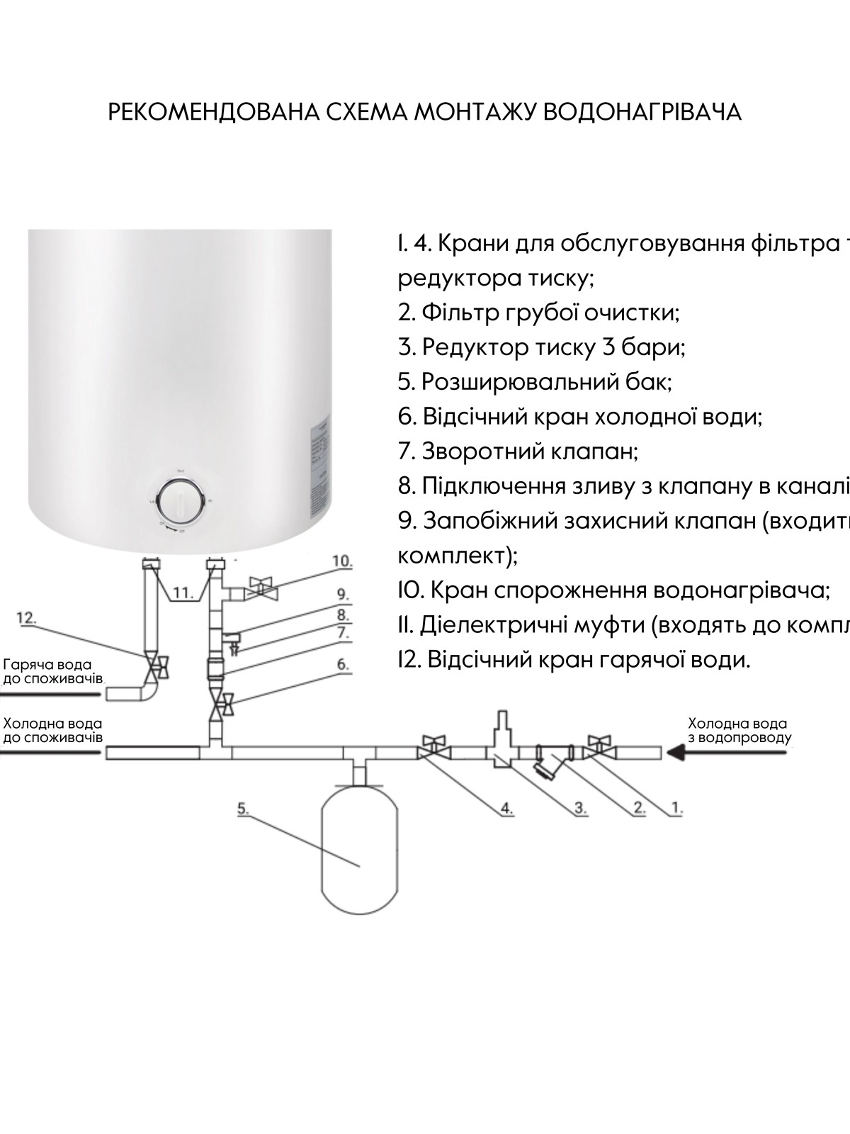 Комплектація: Водонагрівач, кабель з євровилкою, комплект кріплення, інструкція, гарантійний талон, запобіжний клапан