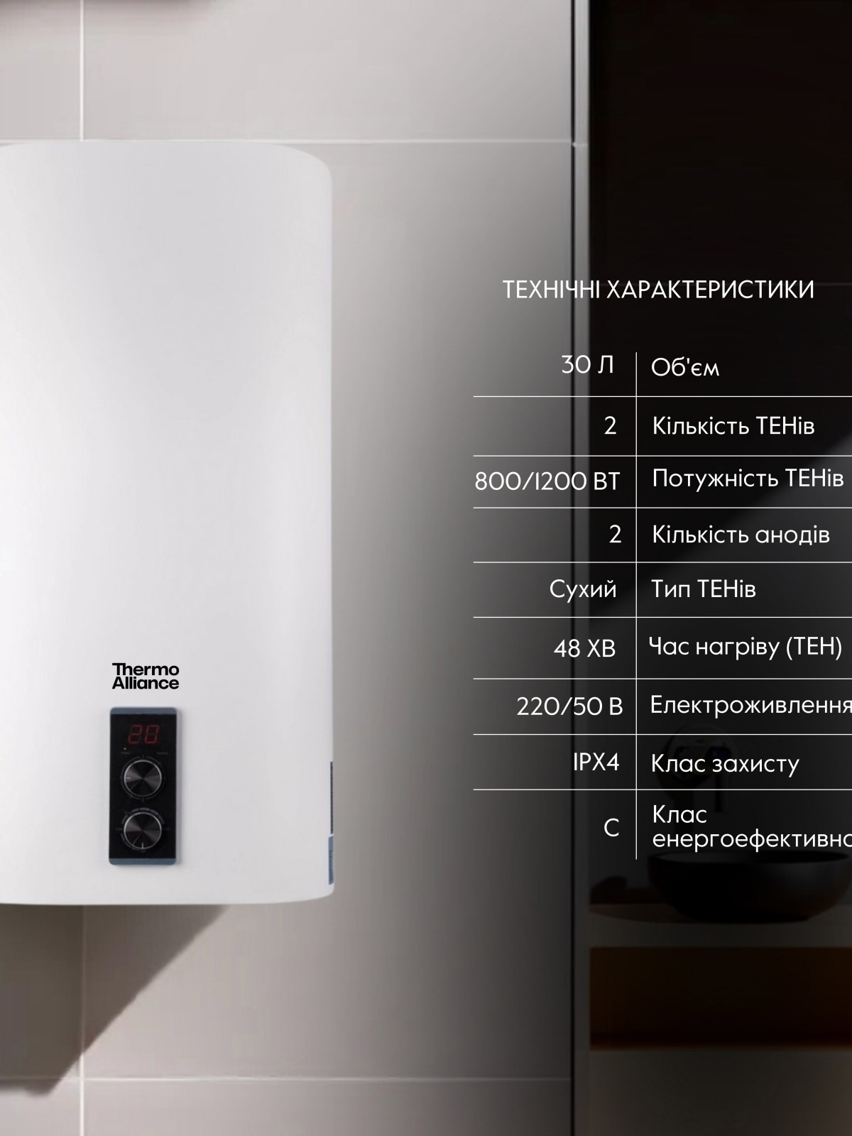 Водонагрівач Thermo Alliance 30 л, сухий ТЕН 2 кВт (0,8+1,2) DT30V20GPDD/2 namp;#8212; сучасний бойлер в плоскому корпусі. Нагрівальних елементів два namp;#8212; 800 і 1200 Вт. Відсутність прямого контакту з водою збільшує термін їх служби. Для захисту від корозії бака зсередини вкритий шаром високоякісної емалі. Панель управління з електронним дисплеєм. Максимальна температура нагріву води - 75namp;#176;C. В інструкції до електроводонагрівача докладно описаний процес монтажу та експлуатації.