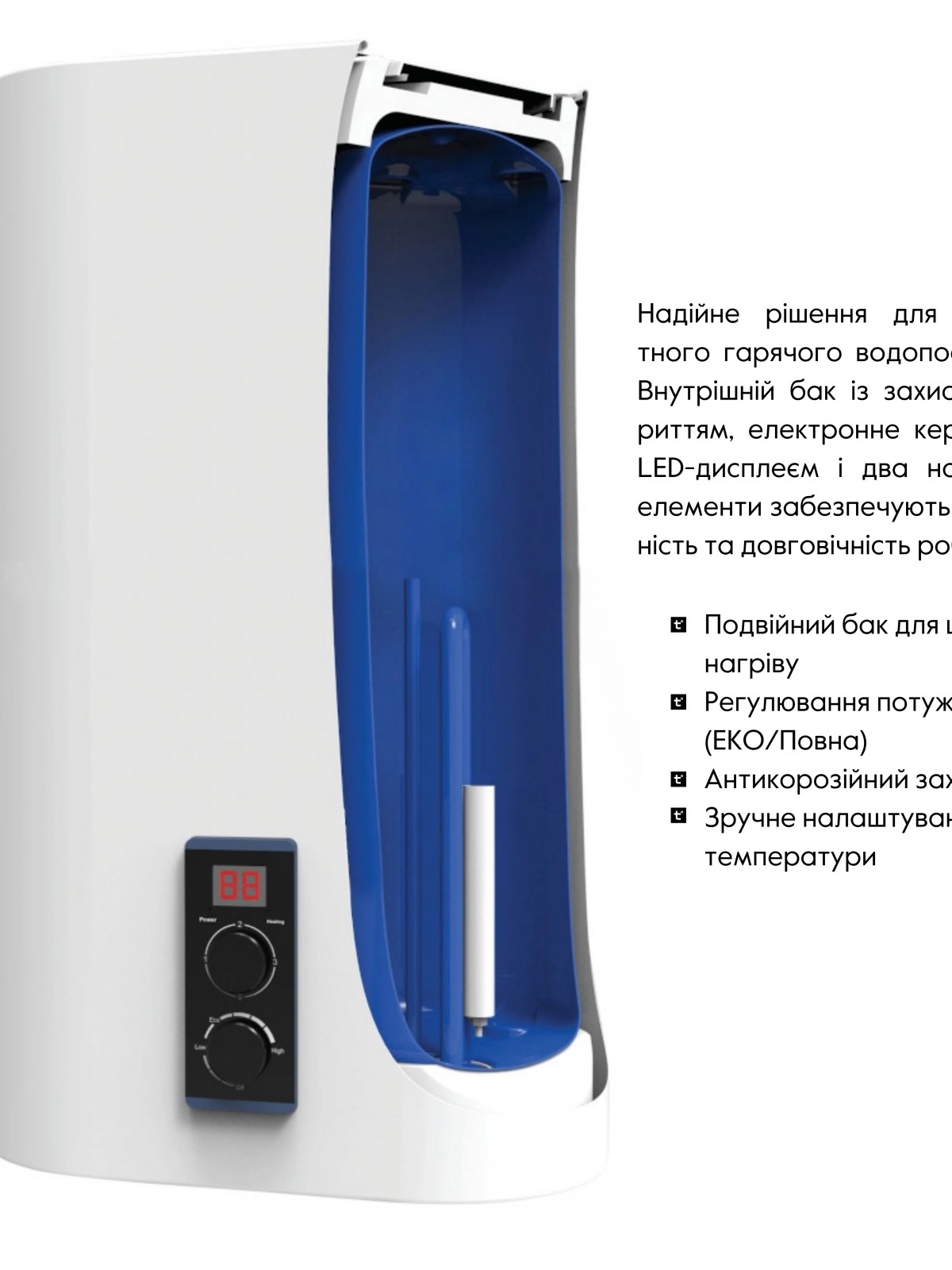 Комплектація: Водонагрівач, кабель з євровилкою, комплект кріплення, інструкція, гарантійний талон, запобіжний клапан