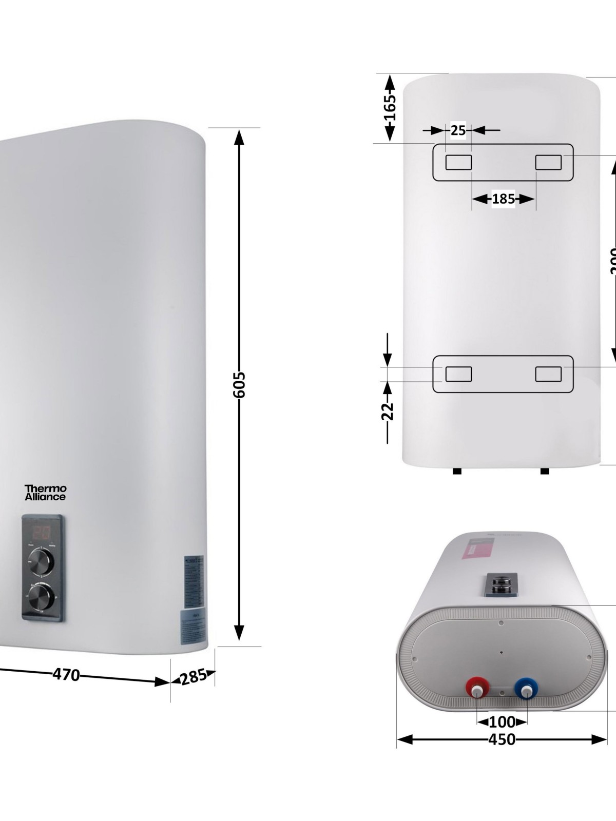 Плоский водонагрівач Thermo Alliance 30 л, мокрий ТЕН 2 кВт (0,8+1,2) DT30V20G(PD)/2. Патрубки підключення води розташовані внизу. Встановлювати такий нагрівальний прилад слід вертикально. В інструкції наведено монтажну схему та рекомендації з експлуатації виробу. Сталевий бак усередині захищений від корозії емалевим покриттям та магнієвими анодами. Товщина внутрішнього бака namp;#8211; 2 мм.