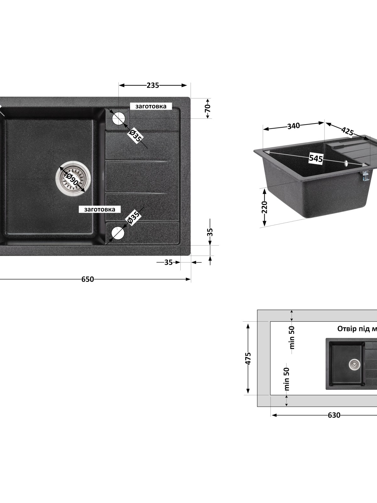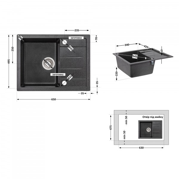 Комплектація: Мийка, сифон, злив/перелив, корзинчастий вентиль, кріплення.