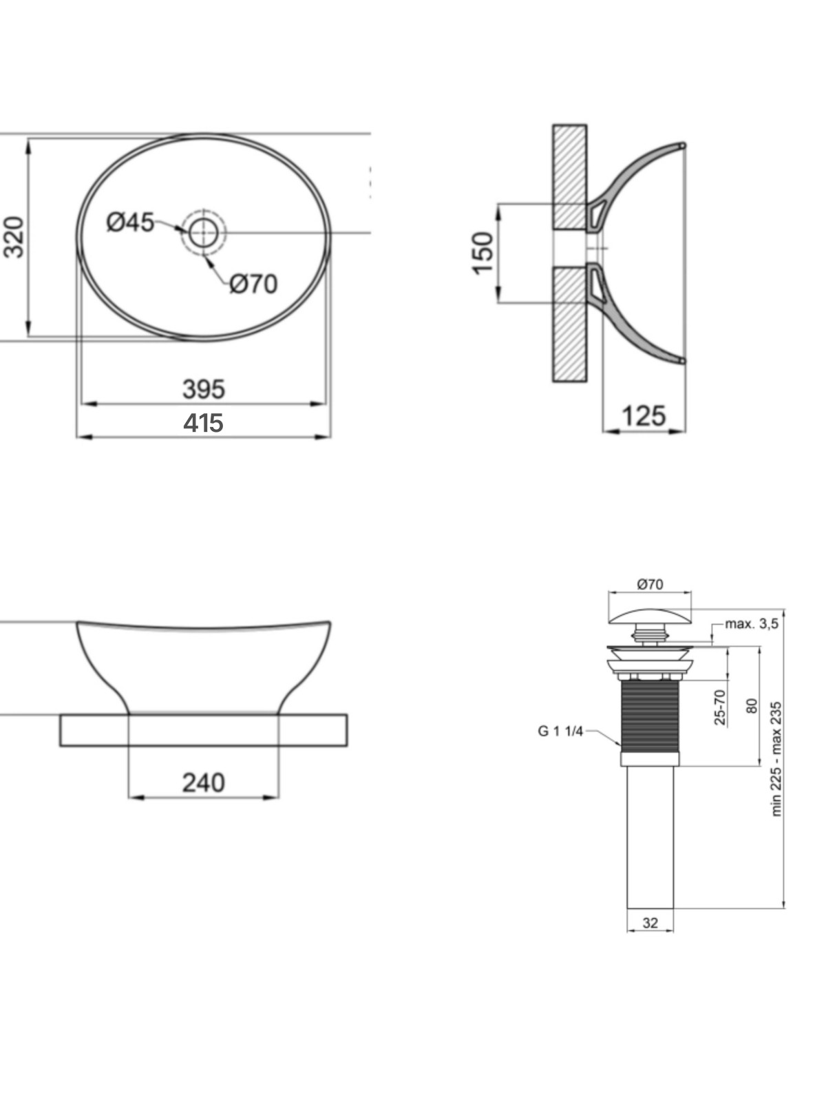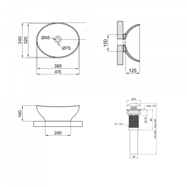 Габаритні розміри виробу (ШхГхВ), мм: 410x335x145 - раковина; 70х70х225 - донный клапан