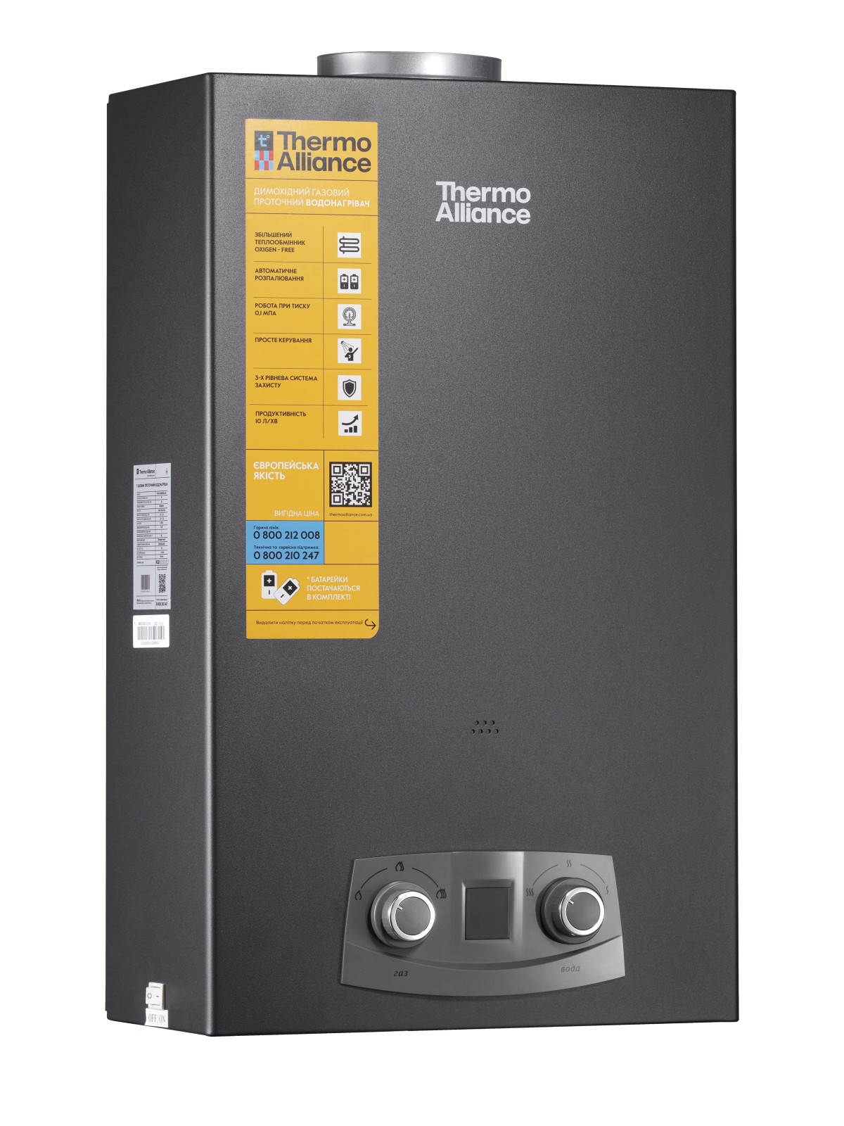 Газова колонка Thermo Alliance димохідна JSD20-10N-QB EURO+ 10л Black (чорна) namp;#8212; відмінне рішення для задоволення господарсько-побутових потреб у гарячій воді. Видалення продуктів згоряння газу відбувається за допомогою природної тяги. Електроживлення, яке необхідне для запуску процесу розпалу при відкритті крана ГВП, забезпечують дві батарейки постійного струму типу D. Корпус виробу чорного матового кольору , на лицьовій стороні внизу розташовані ручки регулювання параметрів роботи приладу. Теплообмінник виготовленний за технологією Oxygen Free (99,9% міді) вагою 2,4 кг з збільшеним перерізом труб.