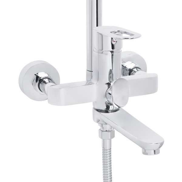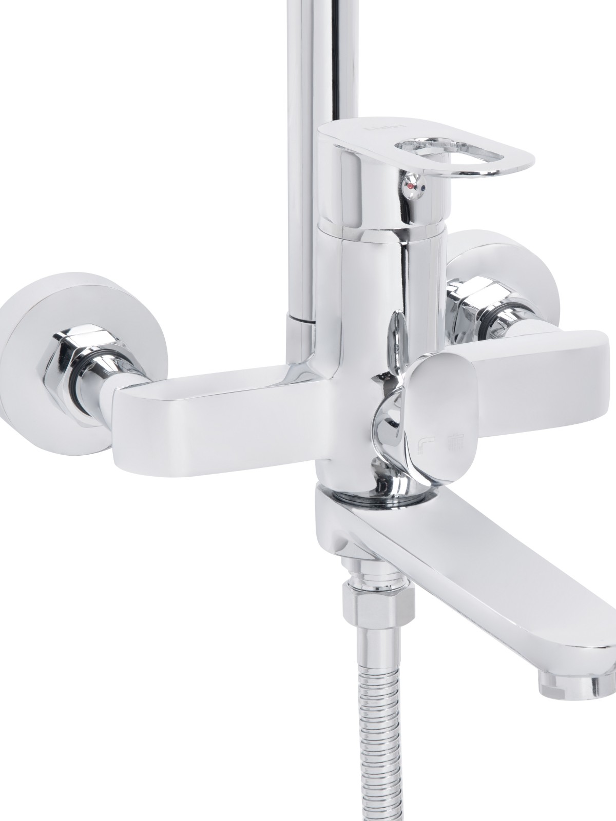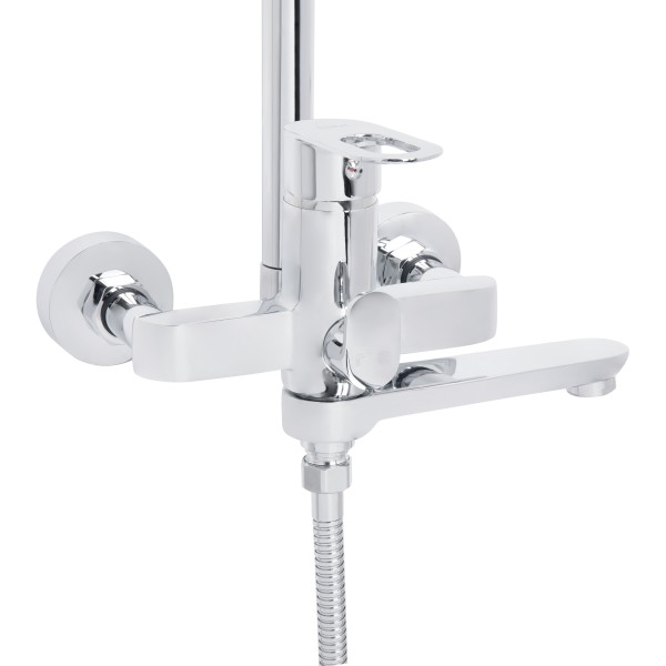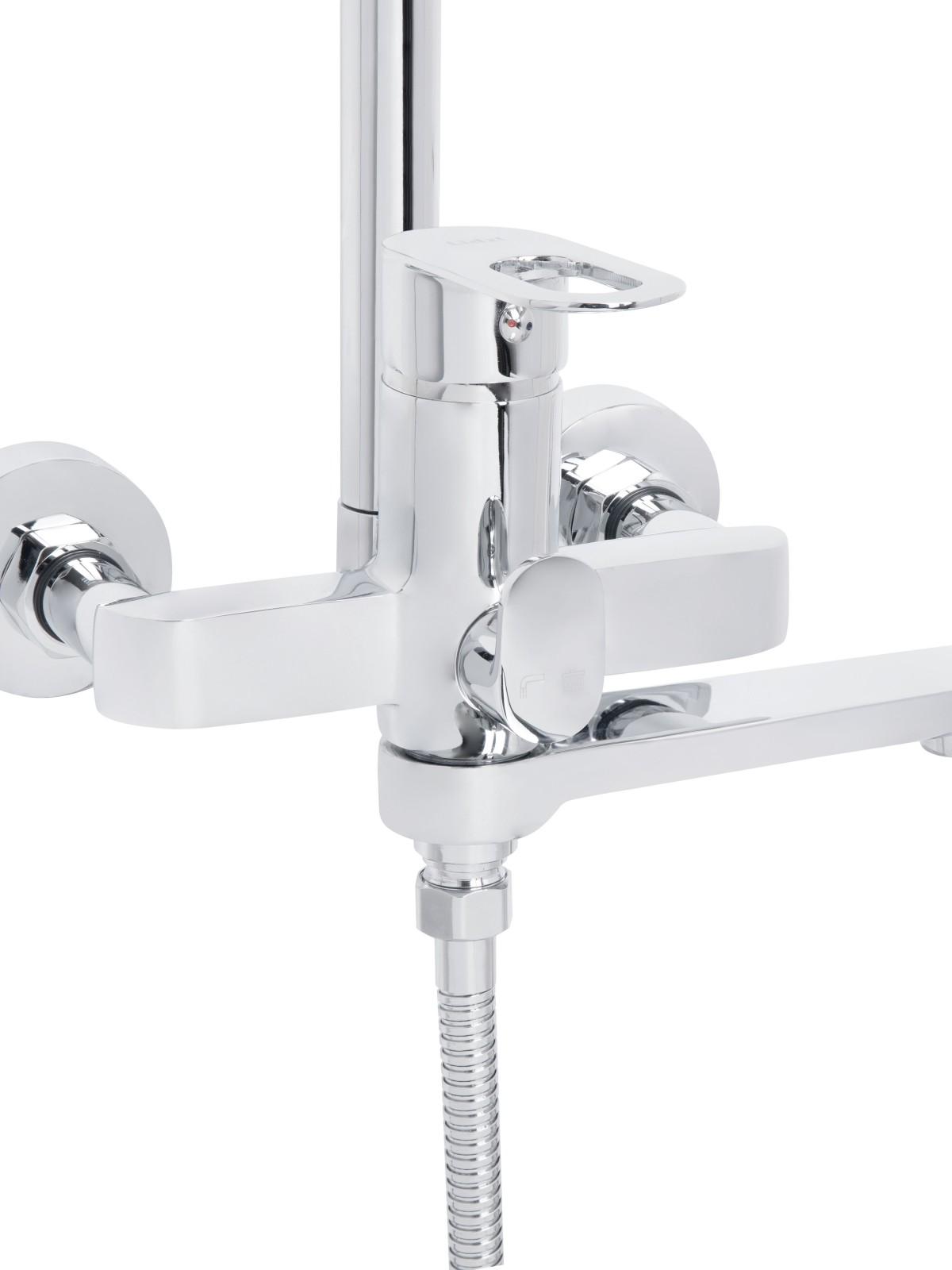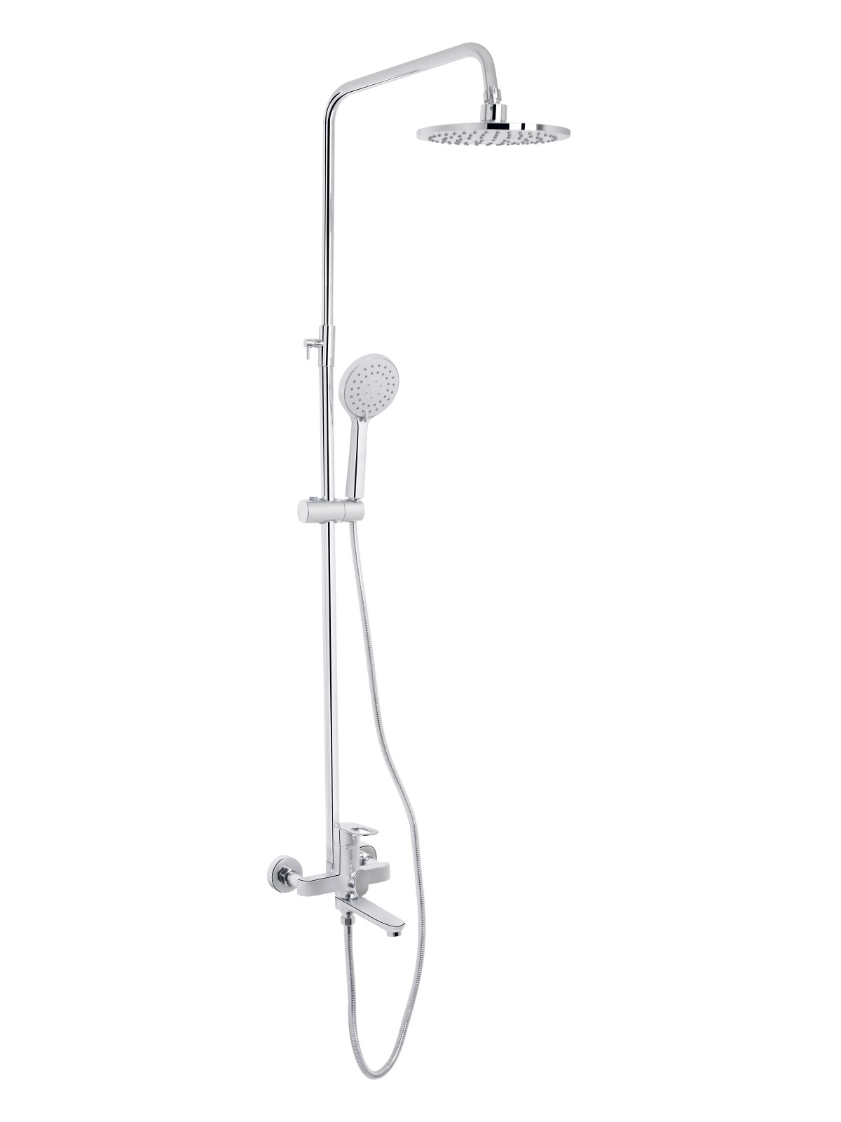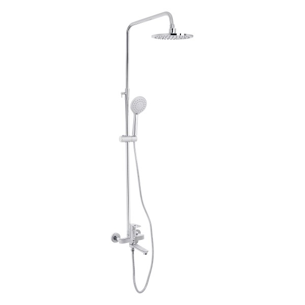 Комплектація: Змішувач, кронштейн для верхнього душу, лійка для верхнього душу, кронштейн для ручного душу, лійка для ручного душу, душовий шланг, душова стійка, кріплення.