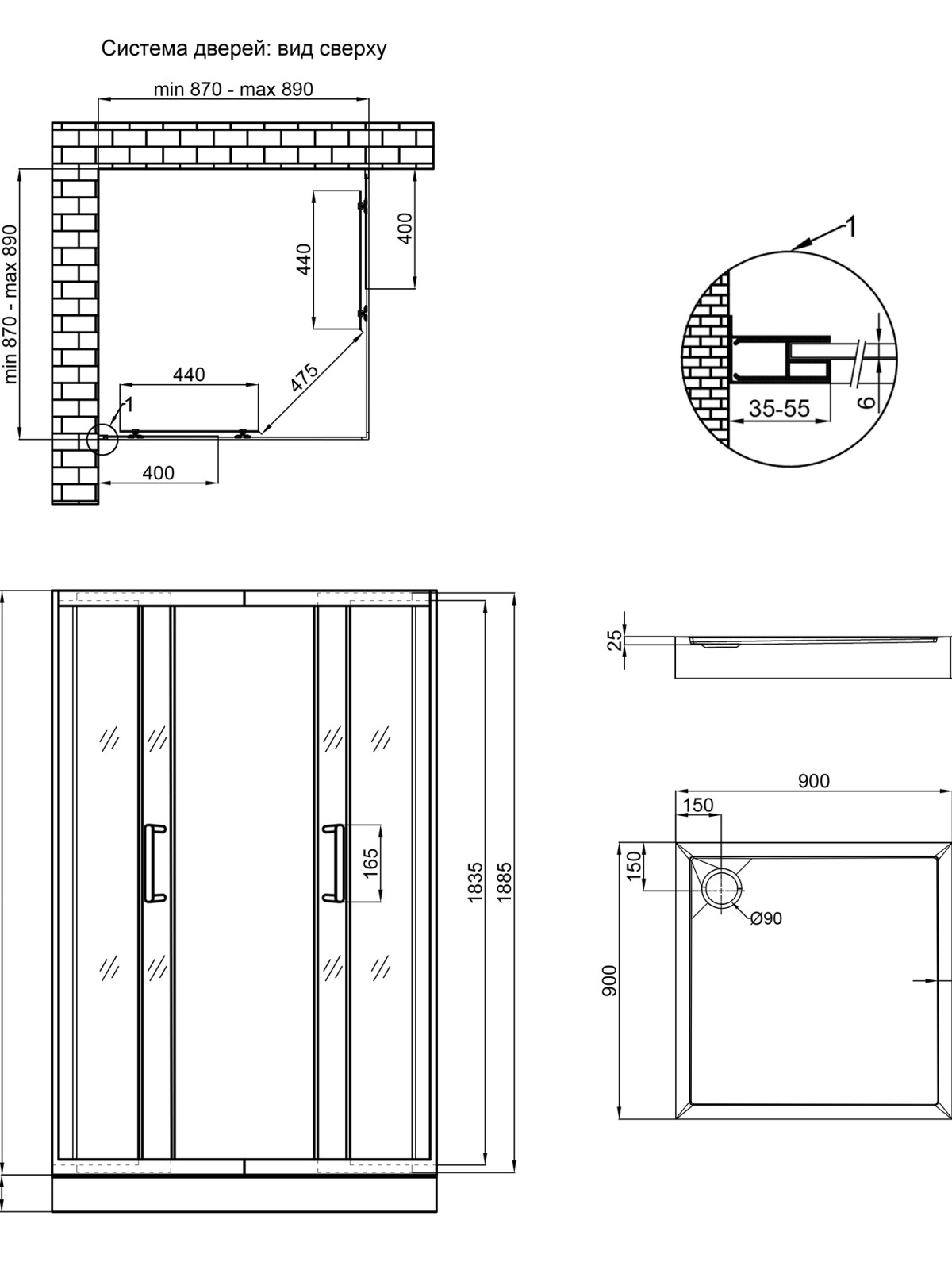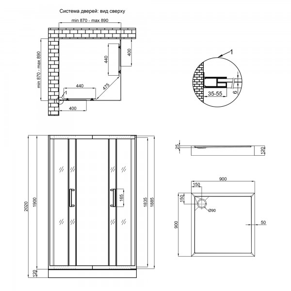 Габаритні розміри виробу (ШхГхВ), мм: 900х900х2020; 900х900х120