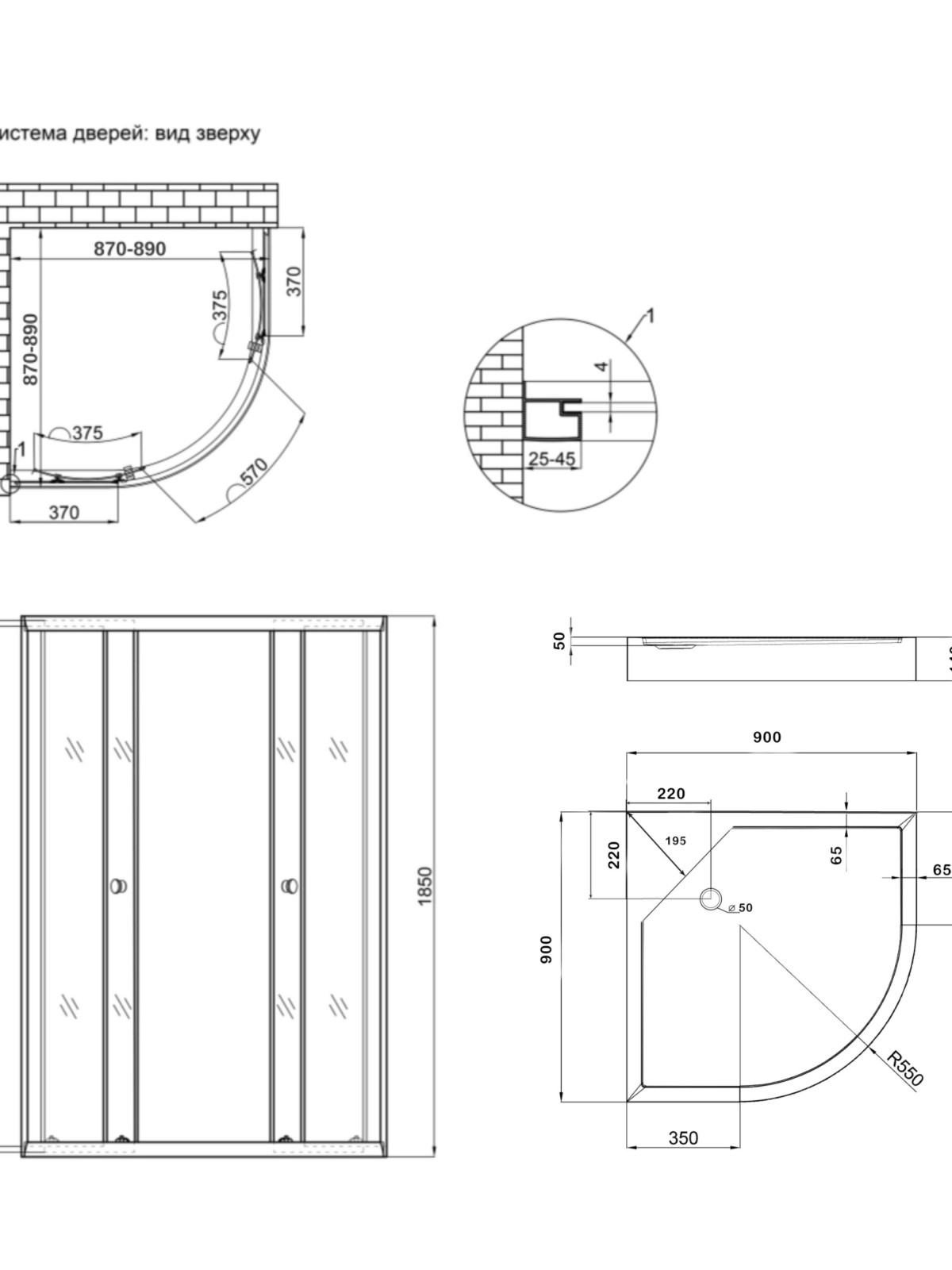 Габаритні розміри виробу (ШхГхВ), мм: 880-920х880-920х2010; 900х900х150