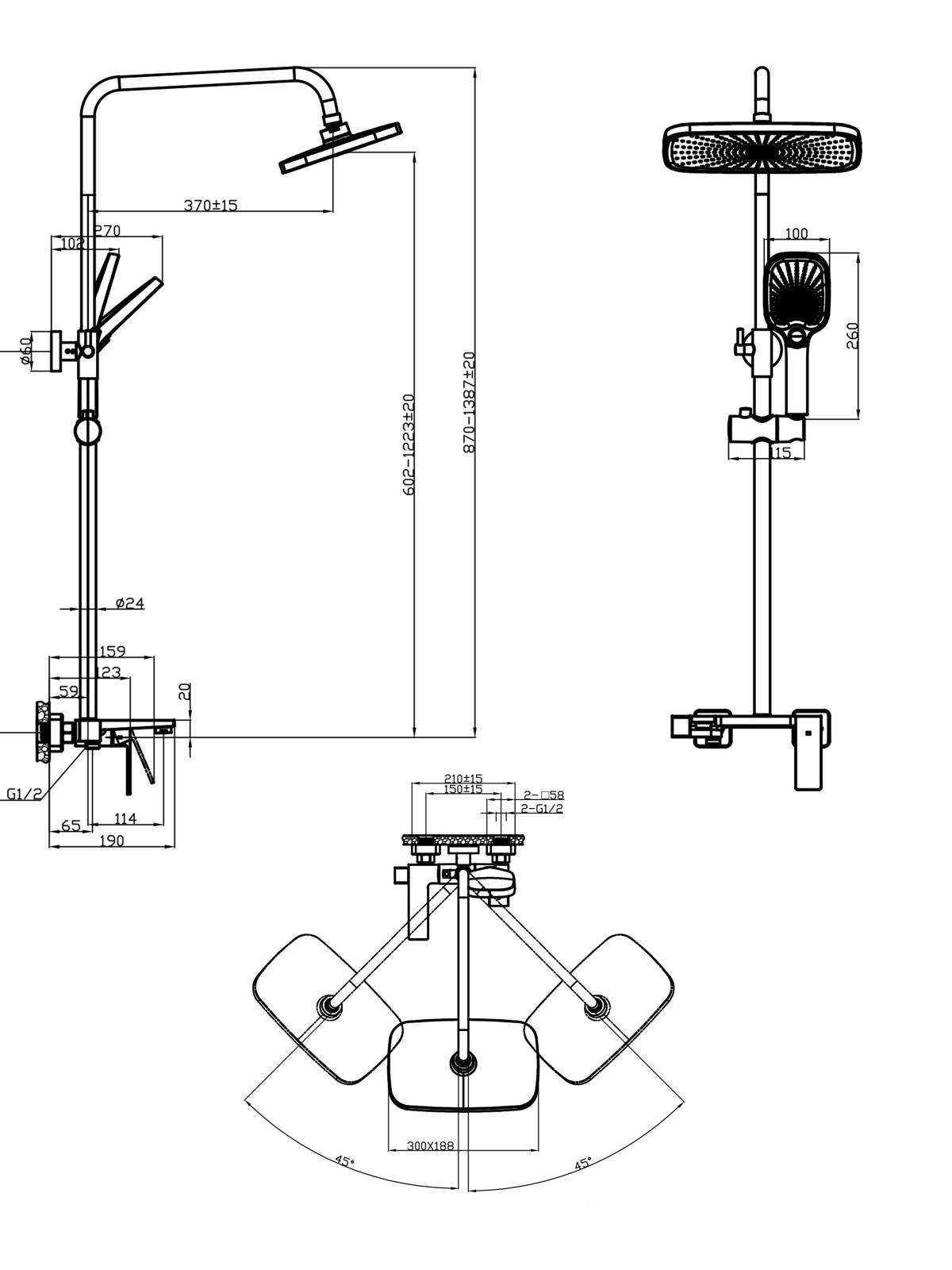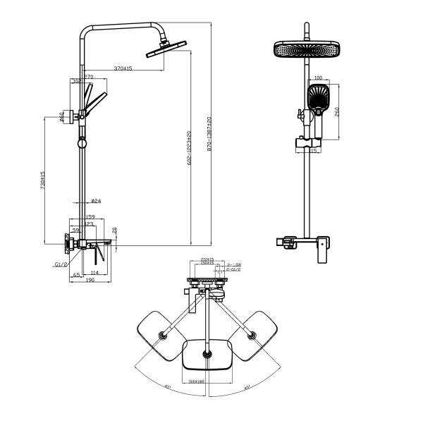 Комплектація: Змішувач, душова стійка, лійка для ручного душу, душовий шланг, кронштейн, деталі кріплення.