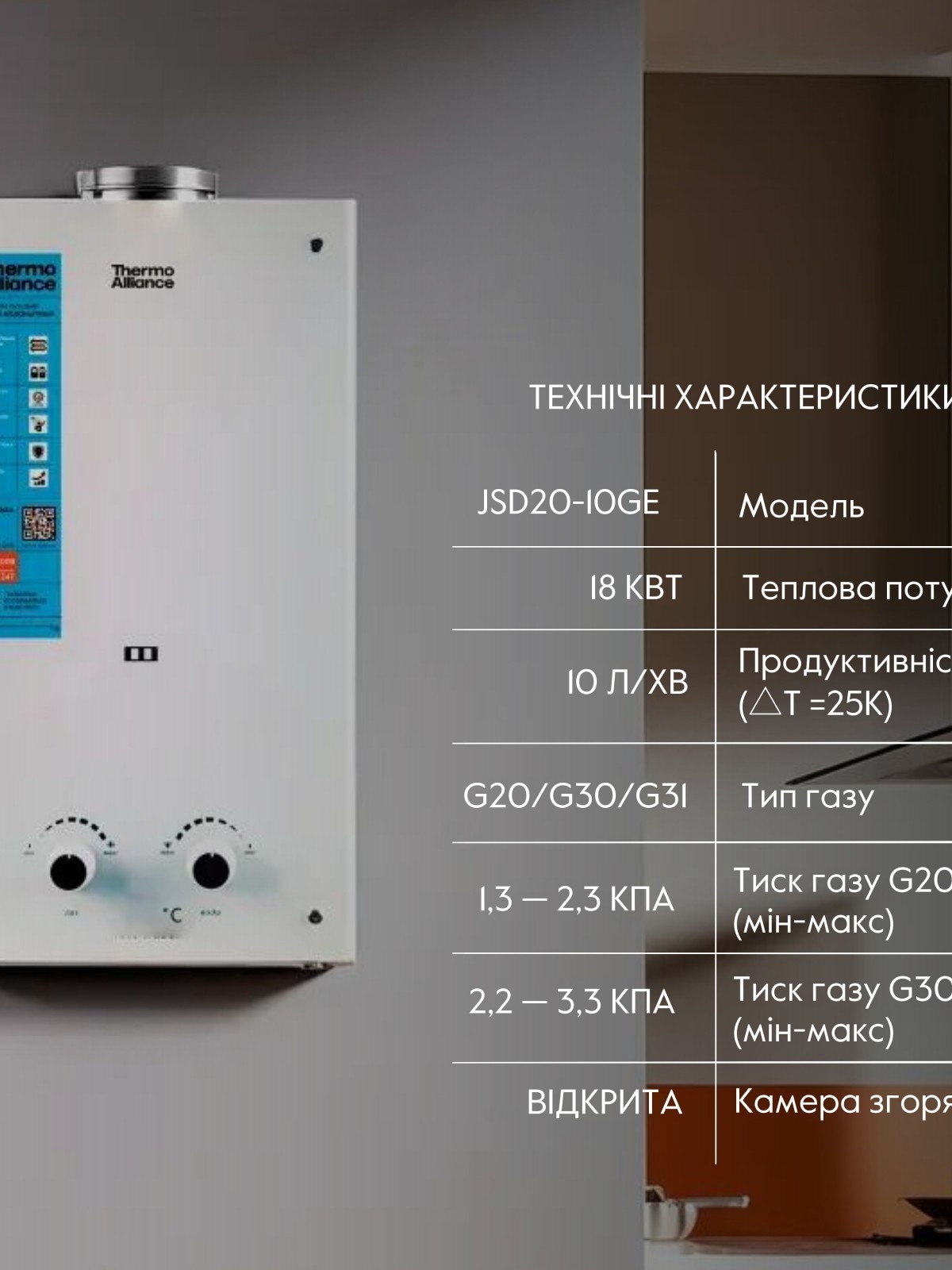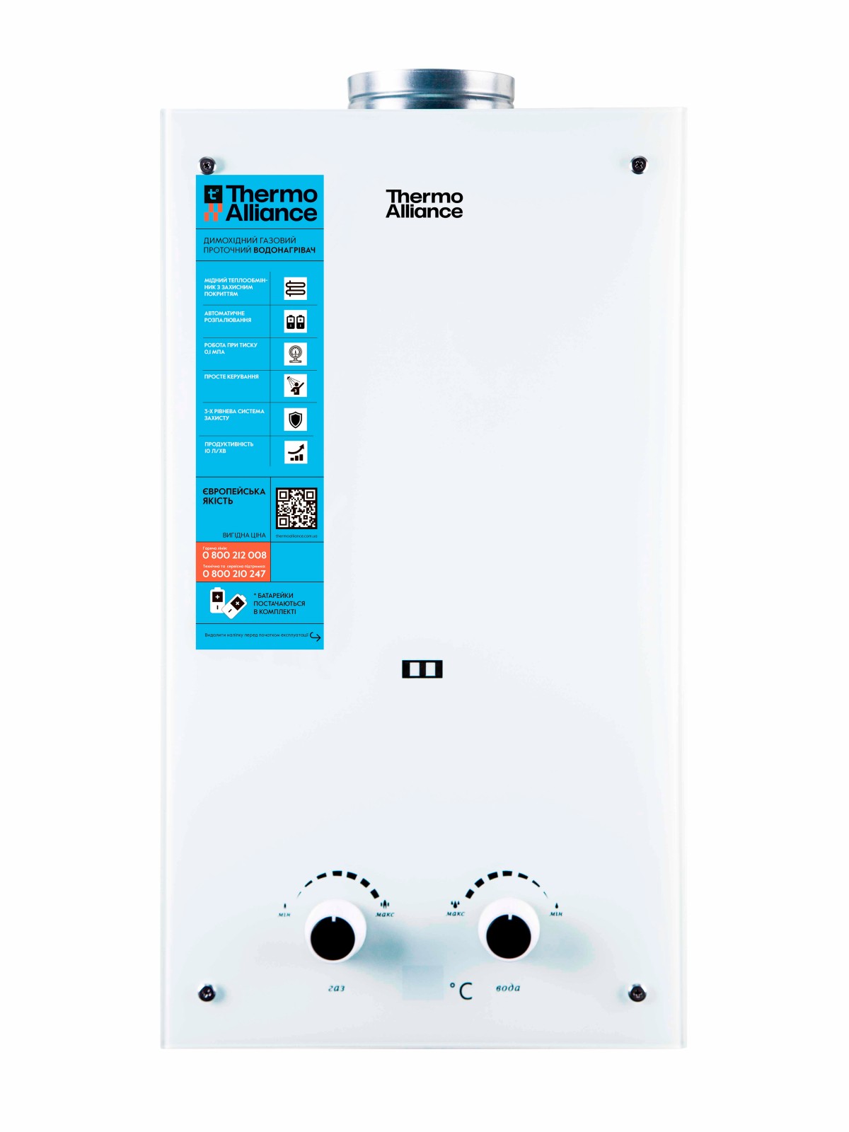 Газова колонка Thermo Alliance димарна JSD20-10GE 10 л скло (біле) namp;#8212; безпечний і ефективний прилад для нагріву проточної води. Видалення продуктів згоряння відбувається завдяки природній тязі в димоході. Наявність полум'я в газовій камері в процесі роботи перебуває постійно під контролем за допомогою електрода іонізації. Для забезпечення процесу розпалу при відкритті крана ГВП необхідні 2 батарейки типу D.