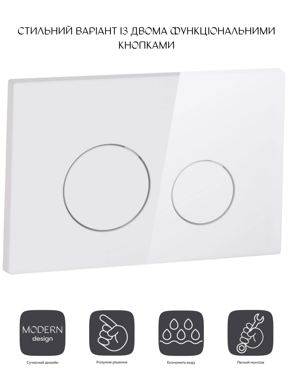 Панель змиву для унітаза Qtap Nest QT0111V1164GW - це сучасне рішення при оснащенні ванної кімнати. Особливістю панелі є двоклавішний блок змиву, який дуже економічний в плані витрати води. Панель змиву із скляною обробкою білого кольору гармонійно поєднується з меблями ванної кімнати і облицювальною плиткою. Передбачає можливість монтажу з горизонтальним розташуванням.