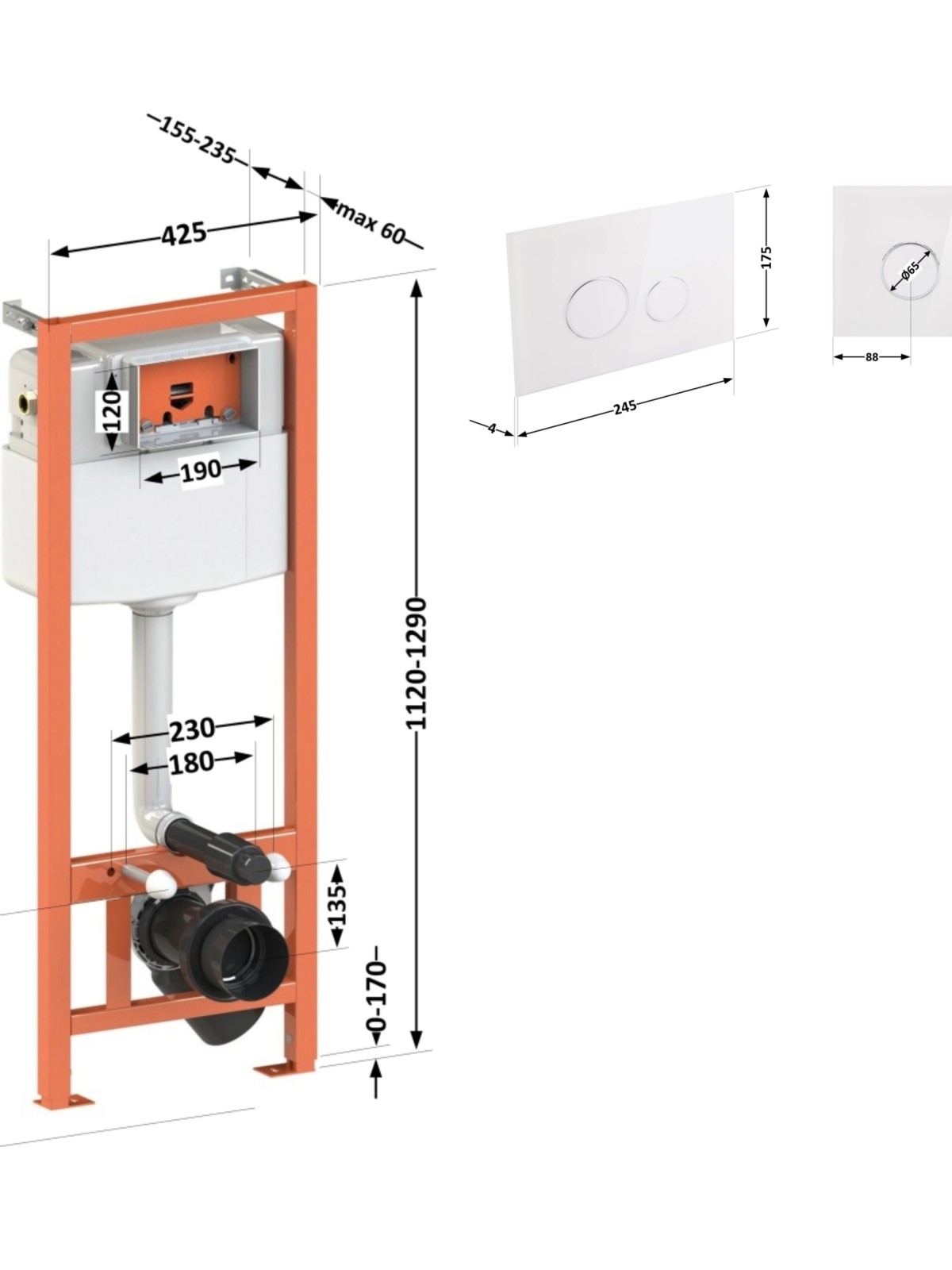 Габаритні розміри виробу (ШхГхВ), мм: Інсталяція: 425х185х1280. Панель змиву: 245х4х175.