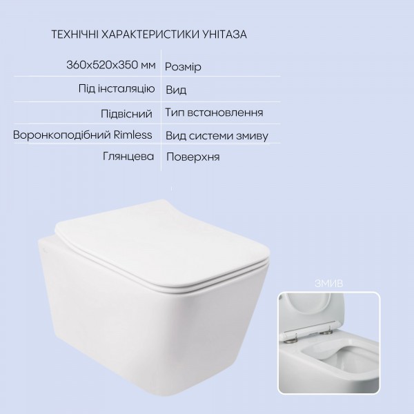 Матеріал: Кераміка – унітаз; дюропласт – сидіння; ABS пластик, метал – інсталяція; ABS пластик - панель змиву