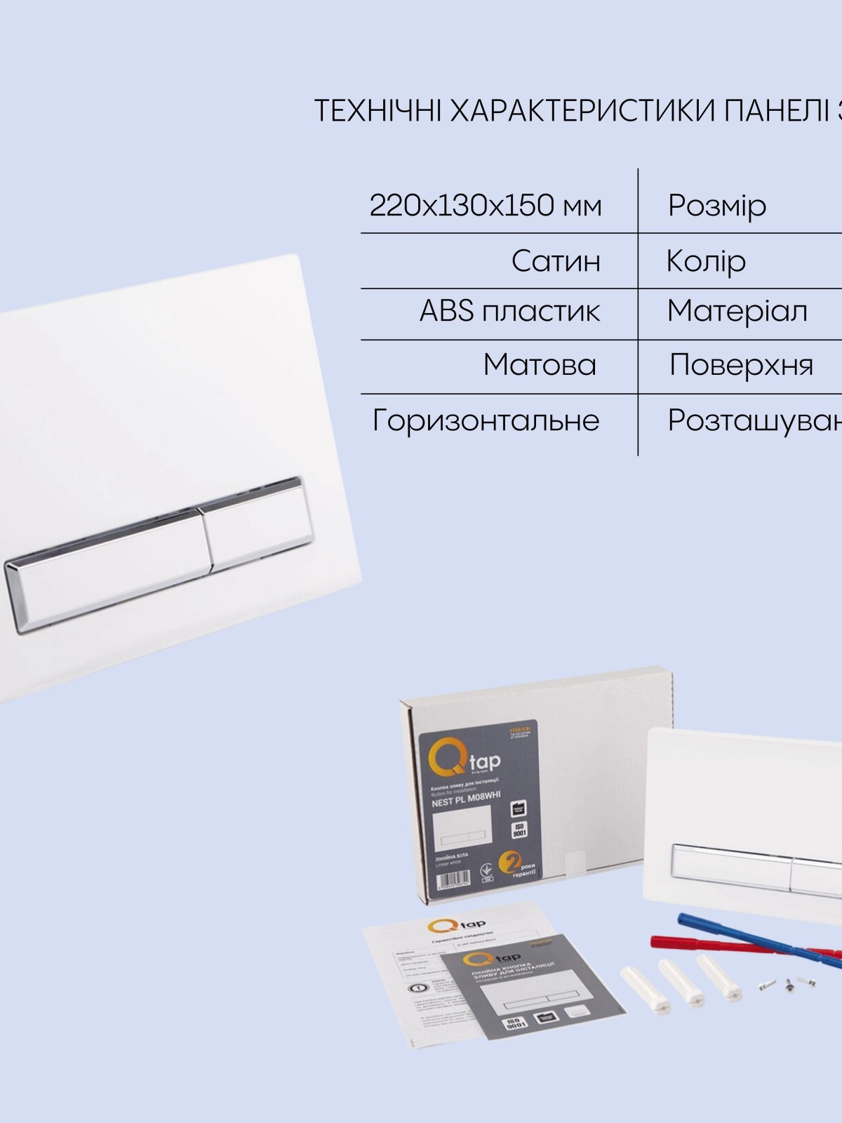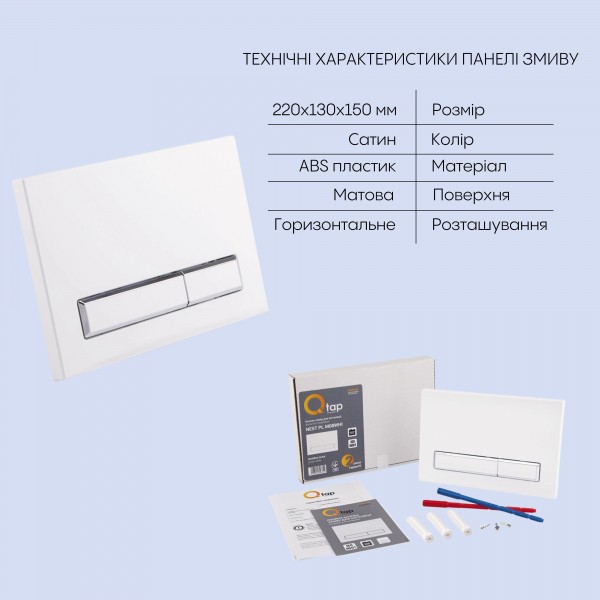 Склад набору: Інсталяція: Qtap Nest QT0133M425. Панель змиву: Qtap Nest QT0111M08V1384W. Унітаз з сидінням: Qtap Crow QT05335170W.