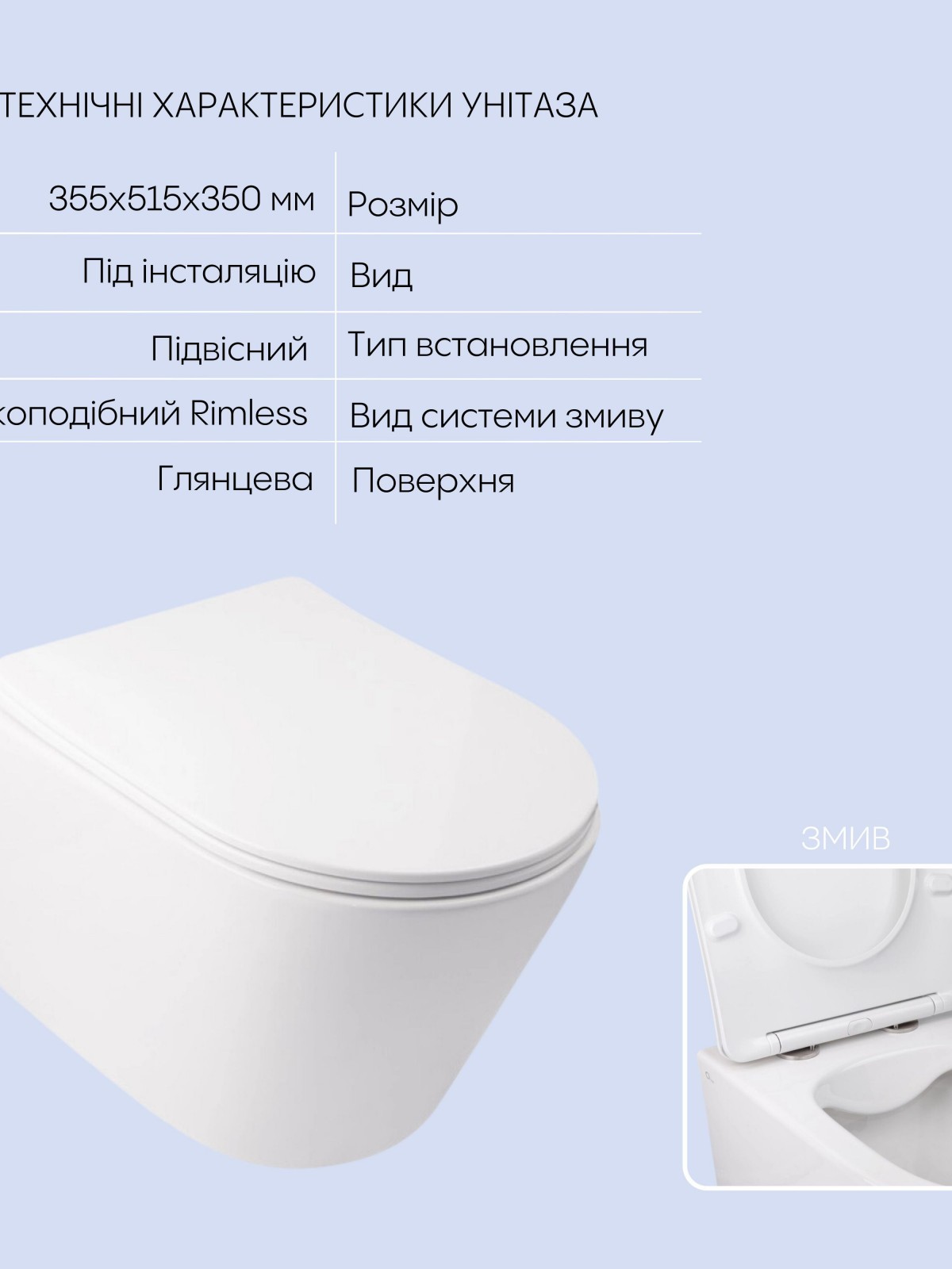 Габаритні розміри виробу (ШхГхВ), мм: Унітаз: 350х355х515. Сидіння: 35х365х455. Інсталяція: 1280х425х235. Панель змиву: 150х220х14.