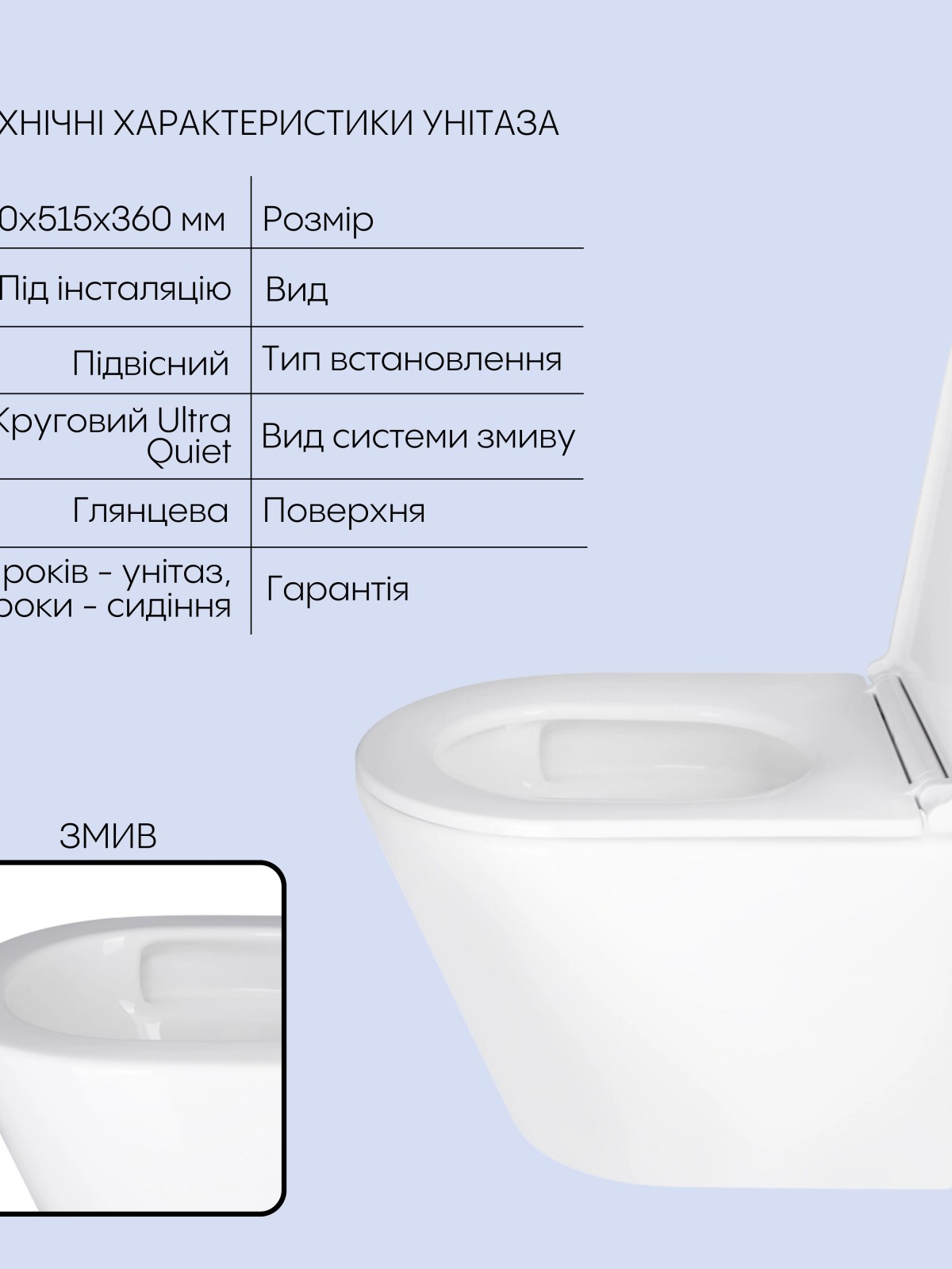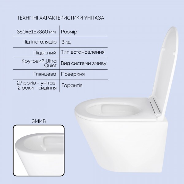 Фірмові технології: Ultra Quite – ультра тиха система змиву.