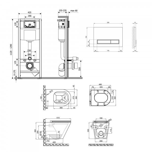 Габаритні розміри виробу (ШхГхВ), мм: Унітаз: 355х340х485. Сидіння для унітазу: 55х345х435. Інсталяція: 1280х425х185. Панель змиву: 150х220х32.