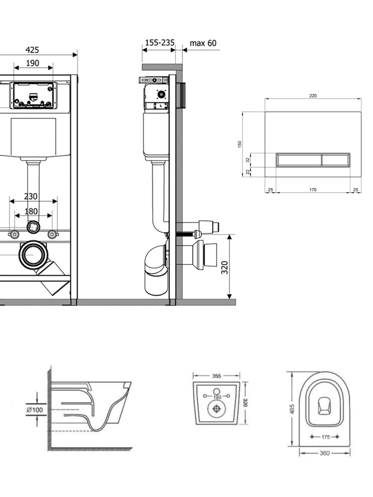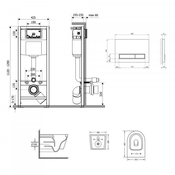 Габаритні розміри виробу (ШхГхВ), мм: Унітаз: 350х355х515. Сидіння для унітазу: 35х365х455. Інсталяція: 1280х425х185. Панель змиву: 150х220х32.