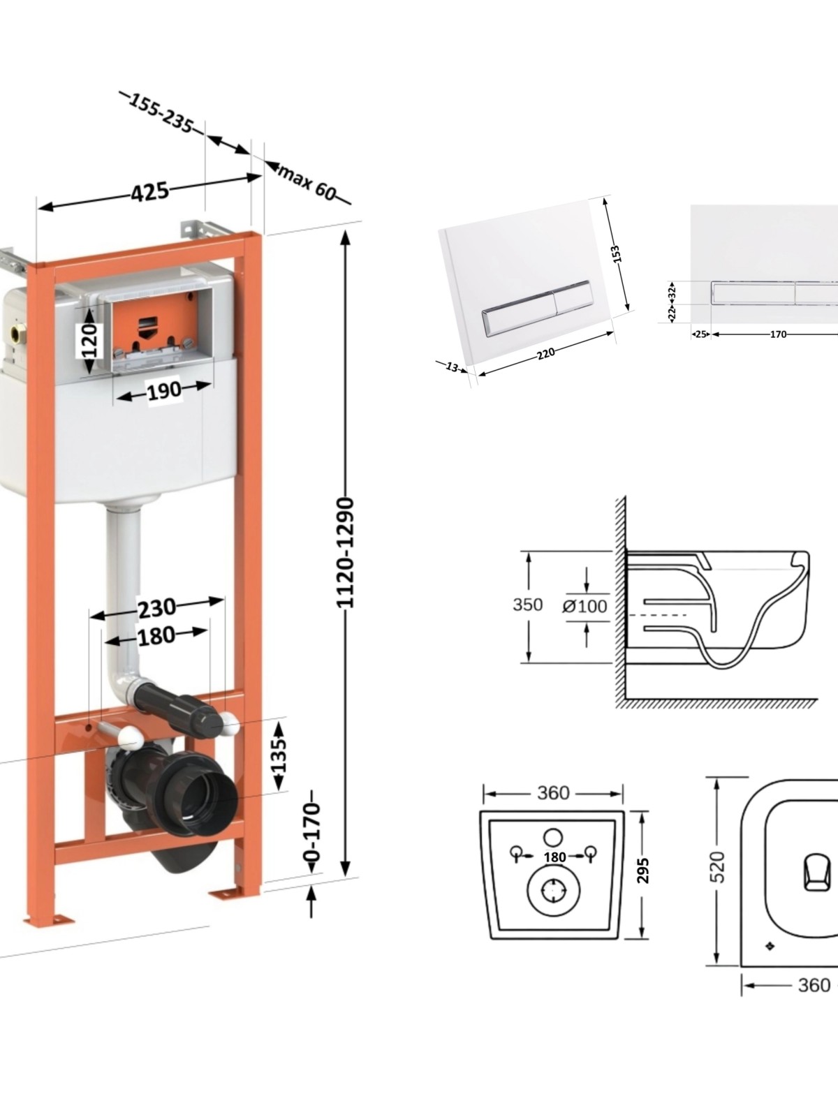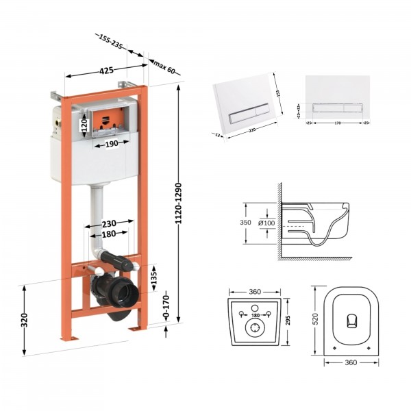 Матеріал: Метал/ABS пластик - інсталяція; ABS пластик - панель змиву; кераміка - унітаз; дюропласт - сидіння для унітазу