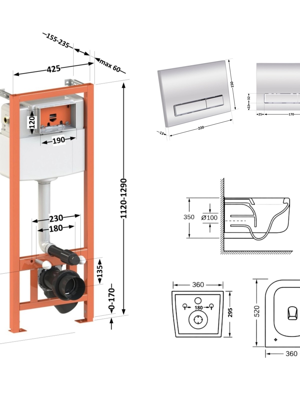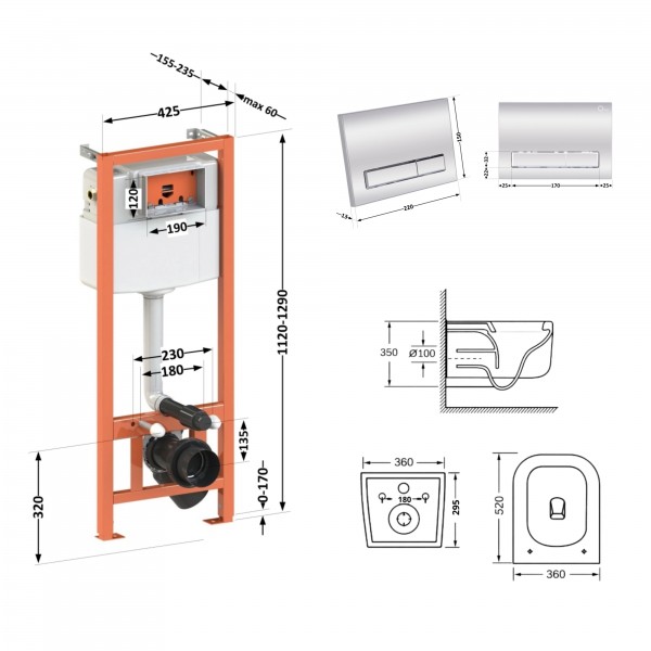 Матеріал: Метал/ABS пластик - інсталяція; ABS пластик - панель змиву; кераміка - унітаз; дюропласт - сидіння для унітазу