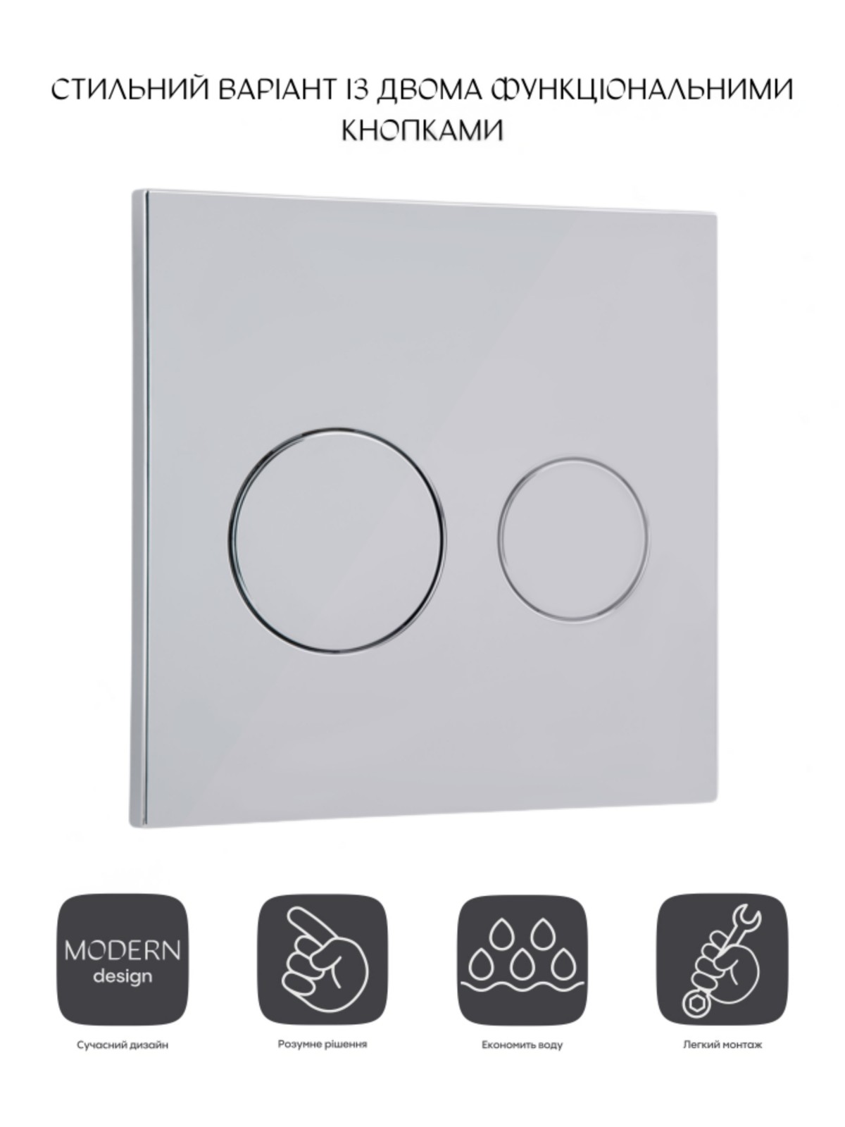 Панель змиву для унітазу Qtap Nest UNI QT0211P01V1009CRM namp;#8211; це сучасне рішення при оснащенні санвузла. Виріб виготовлений з якісного ABS пластику, тип управління зливом namp;#8211; механічний. Особливістю панелі є двоклавішний блок змиву, який дозволяє заощаджувати витрати води. Панель змиву в кольорі хром гармонійно поєднується з меблями ванної кімнати та облицювальною плиткою.
