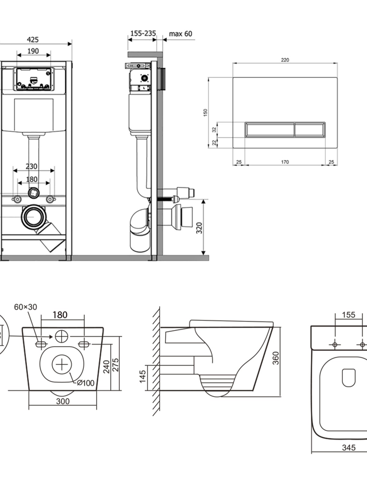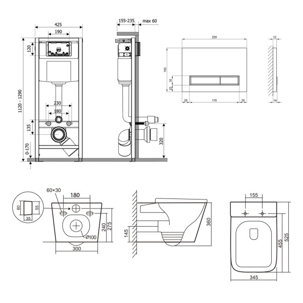 Габаритні розміри виробу (ШхГхВ), мм: 345х525х360 - унитаз; 425х185х1280 - инсталляция; 220х13х150 - панель смыва