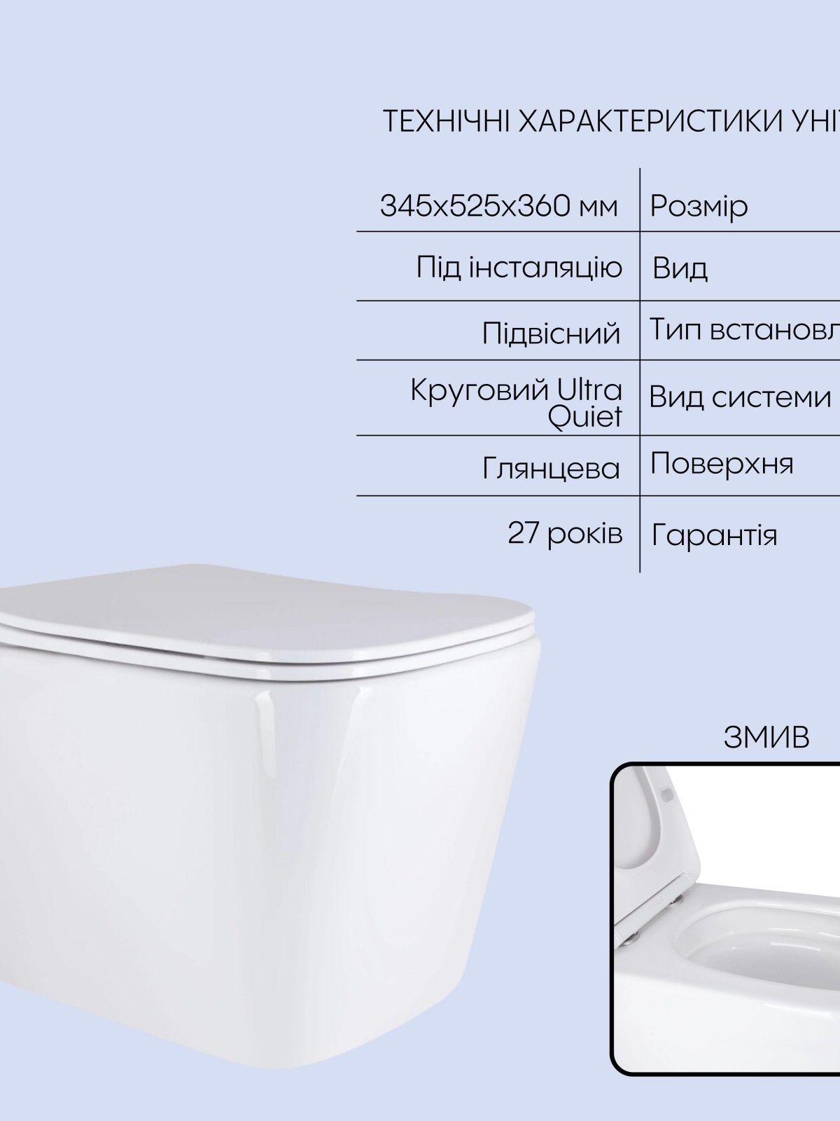 Гарантія: 27 років - унітаз; 10 років - інсталяція; 2 роки - панель змиву, сидіння