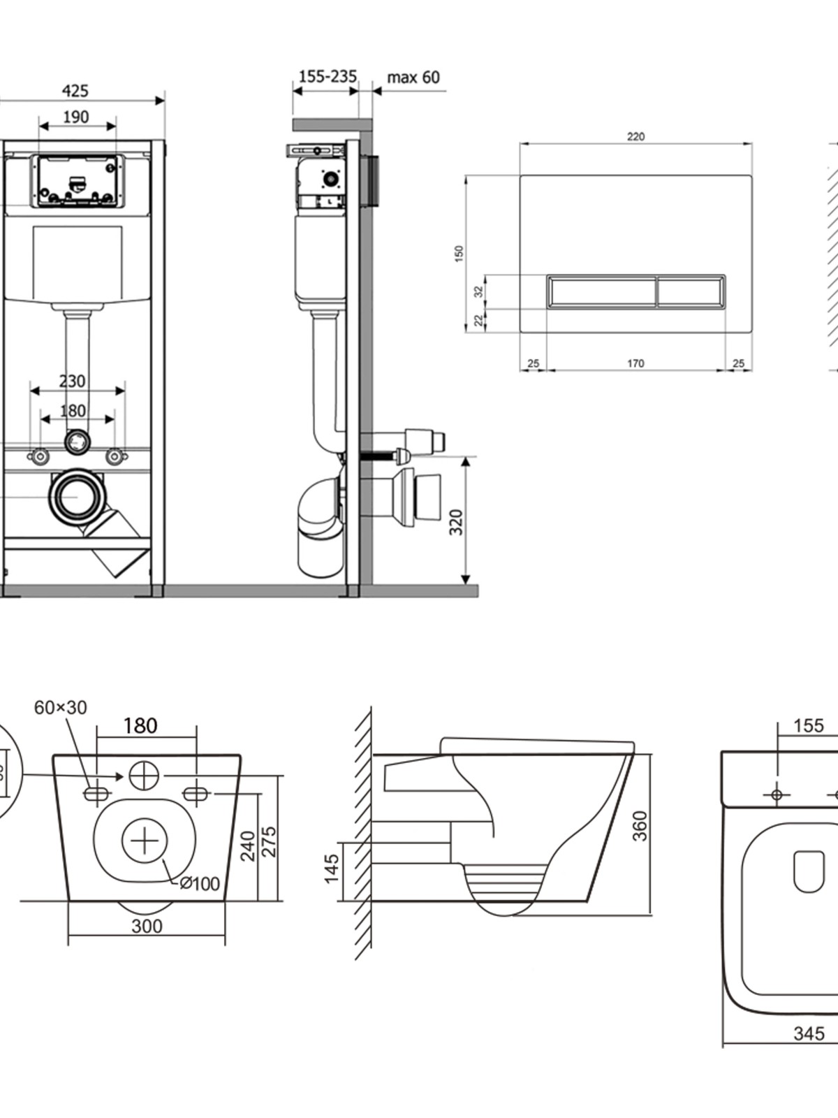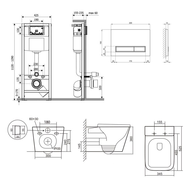 Габаритні розміри виробу (ШхГхВ), мм: 345х525х360 - унитаз; 425х185х1280 - инсталляция; 220х13х150 - панель смыва