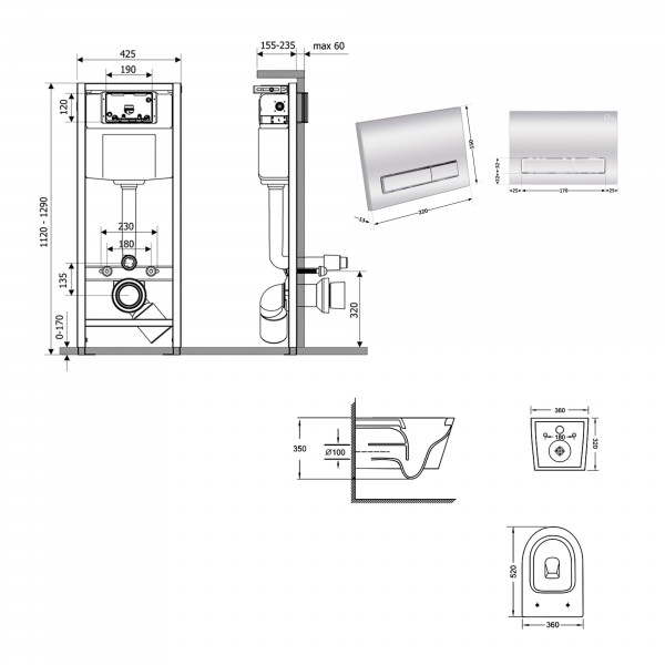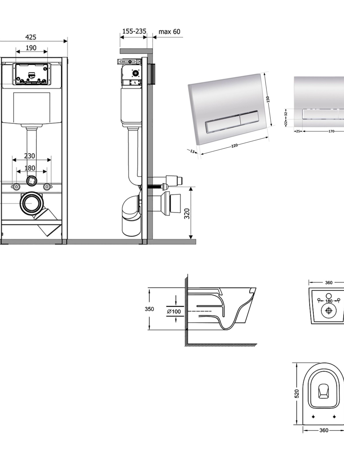Габаритні розміри виробу (ШхГхВ), мм: Унітаз: 520х360х320. Інсталяція: 1280х425х185. Панель змиву: 220х13х150.