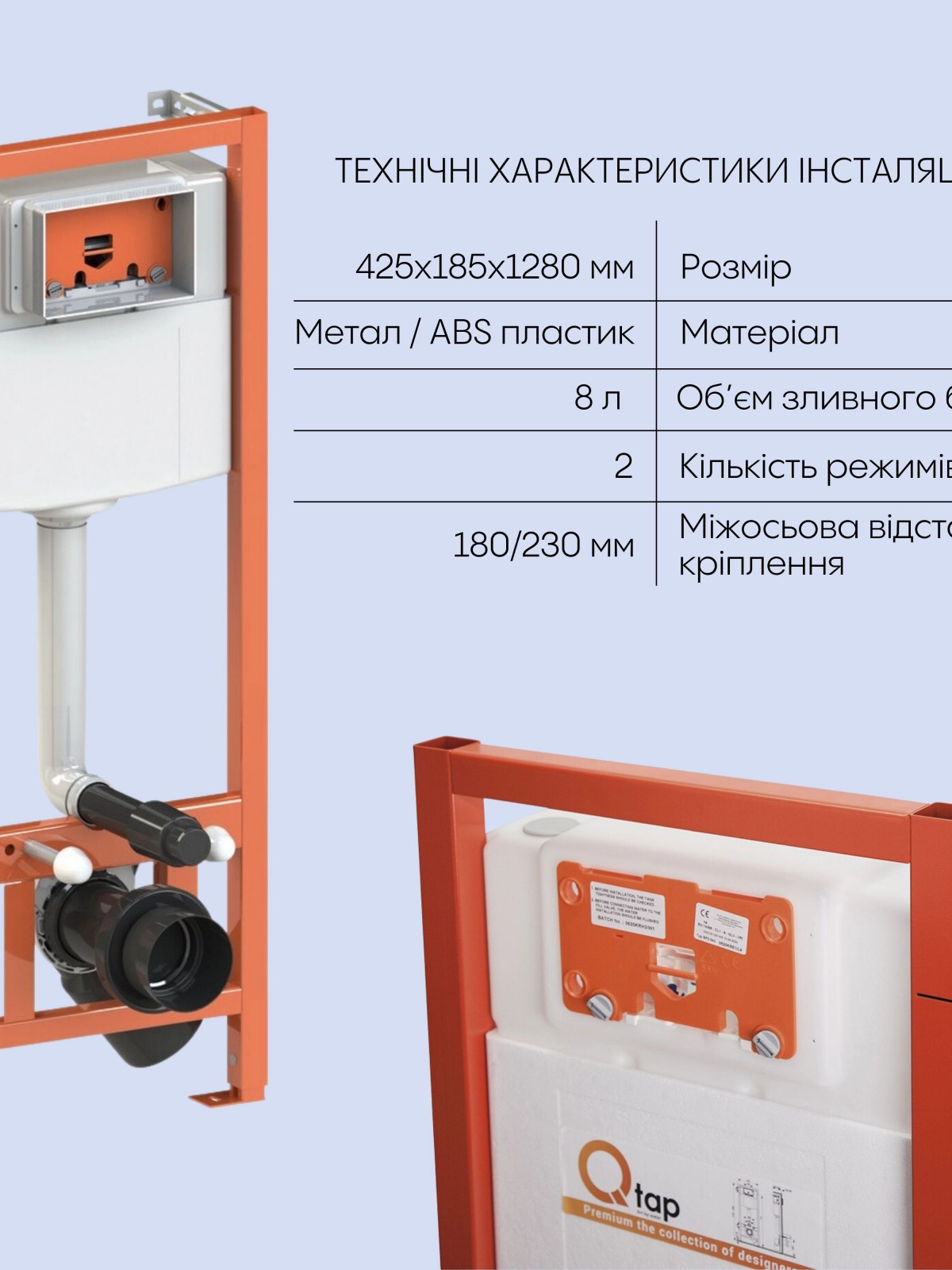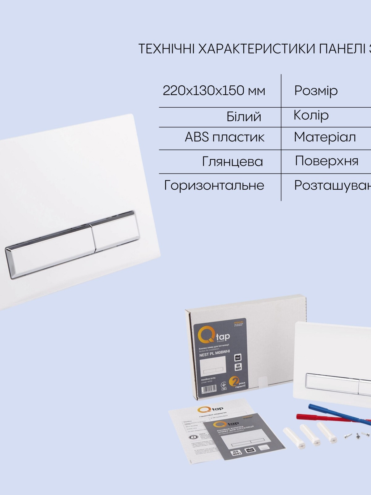 Склад набору: Інсталяція: Qtap Nest QT0133M425. Панель змиву: Qtap Nest QT0111M08V1384W. Унітаз з сидінням: Qtap Jay QT07335176W.